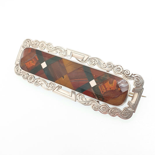 Antique Solid Silver Scottish Brooch Mosaic Agate Jasper Pin Saltire X Cross Bloodstone Large Big Vintage 1800s Womens Jewelry Jewellery