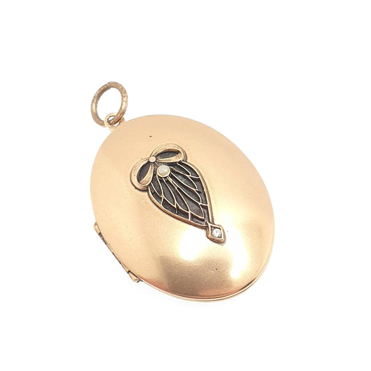 Antique Art Deco Gold Gilt Locket Bow Faux Seed Pearl Diamond Paste Necklace Pendant Large Vintage 1920s Big Womens Ladies Jewellery Jewelry