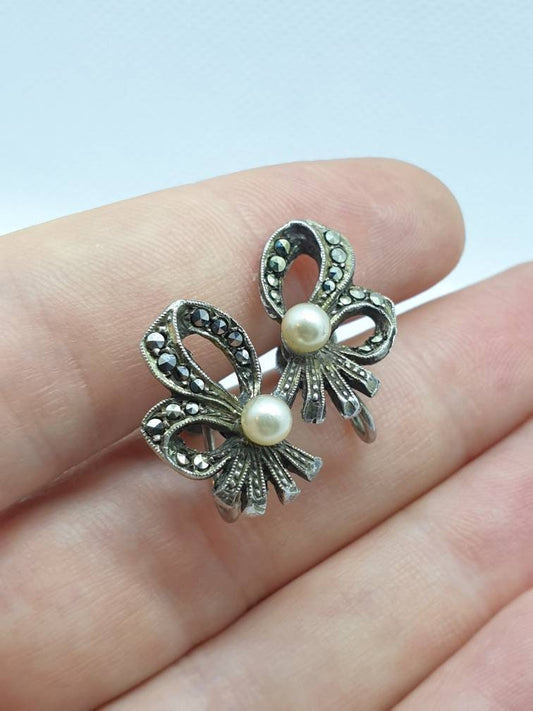 Antique Marcasite & Faux Pearl Screw Back Earrings Ribbon Bow Shape Solid Silver Stamped Sparkly Womens Ladies Jewelry Vintage Jewellery