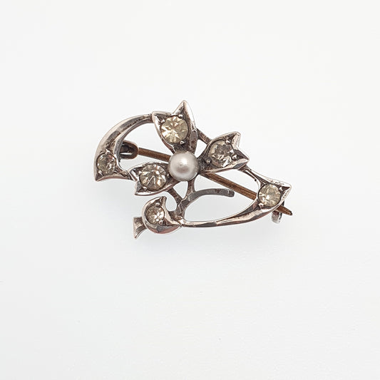 Antique Diamond Paste Flower Solid Silver Brooch Pin Cultured Grey Pearl Tiny Cute Small Daisy Sparkly Womens Vintage Jewelry Jewellery