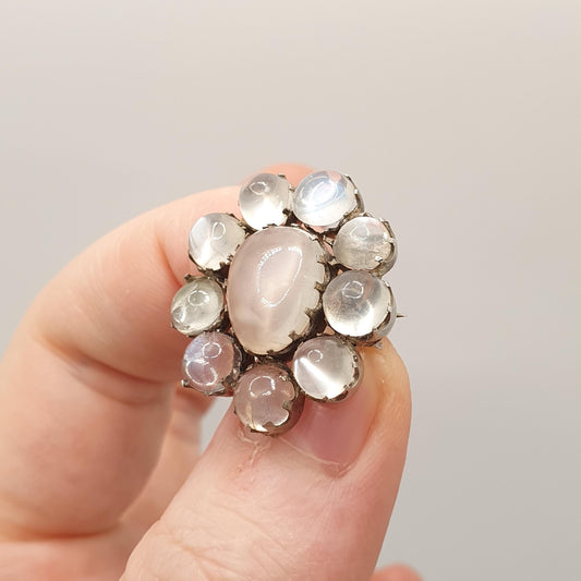 Antique Moonstone Solid Silver Brooch Cluster Halo Victorian Cabochon Cut Handmade Vintage Blue Adularescence Womens Jewelry Jewellery