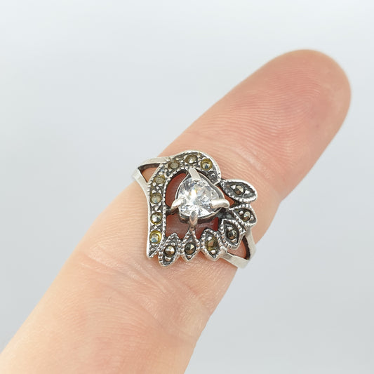 Vintage Sterling Silver Heart Ring CZ & Marcasite Love Heart Shape Cut Large Sparkly Solid 925 Womens Jewelry Retro Jewellery UKQ.5 US8.5