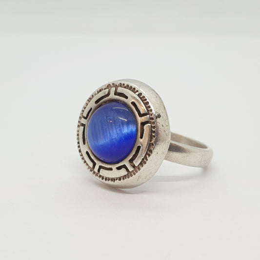 Vintage Sterling Silver Ring Blue Faux Moonstone Cats Eye Greek Key Pattern Large Big Circle Womens Ladies Jewelry Jewellery UKM.5 US6.75