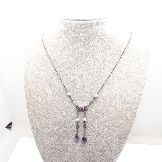 Antique Arts & Craft Sterling Silver Amethyst Necklace Lavalier Lariat Art Nouveau Freshwater Pearl Pendant Womens Jewelry Jewellery