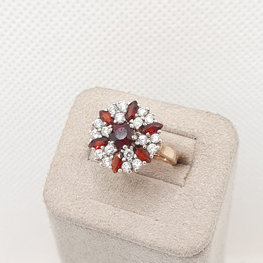 Vintage Solid 9ct Gold Garnet Cluster Ring 375 9k CZ Hallmarked Crimson Halo Red Pyrope Genuine Gemstone Womens Retro Jewelry Jewellery