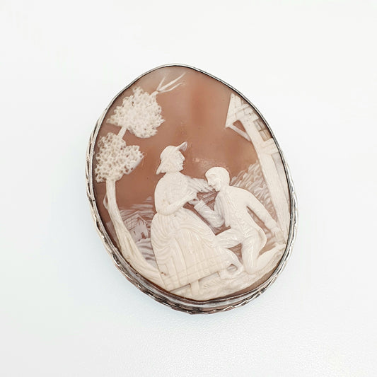 Antique Solid Silver Victorian Cameo Brooch Man Proposing Proposal Large Big Rare 1800s Genuine Shell Fine Unique Carved Vintage Womens