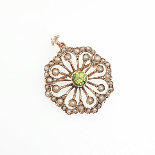 Antique 9k 9ct Gold Peridot Olivine Necklace Pendant Brooch Seed Pearl Flower Art Nouveau Edwardian Solid 375 Elegant Jewelry Jewellery