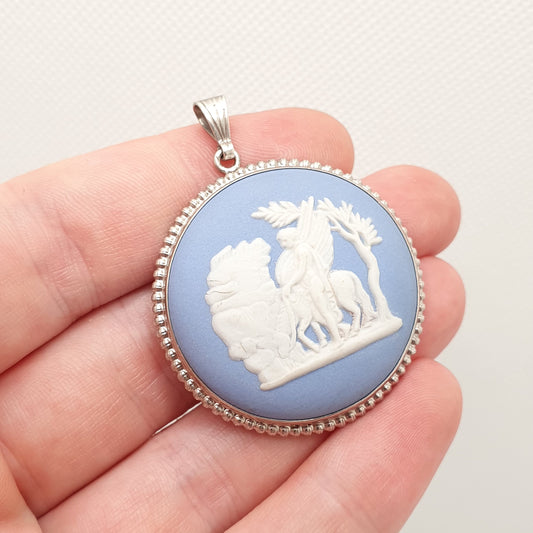 Vintage Sterling Silver Wedgwood Necklace Pendant Very Large 1960s Original Box Boxed Sky Blue Jasperware Cameo Big Womens Jewelry Jewellery