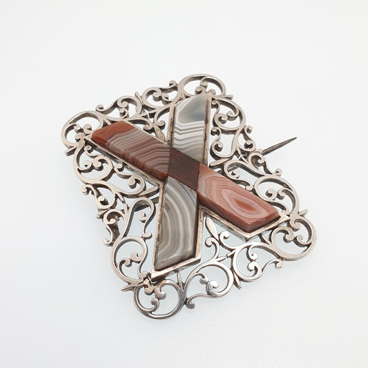 Antique Scottish Solid Silver X "X" Brooch Agate Victorian Bloodstone Jasper Large Big Gemstone Vintage 1800s Womens Jewelry Jewellery