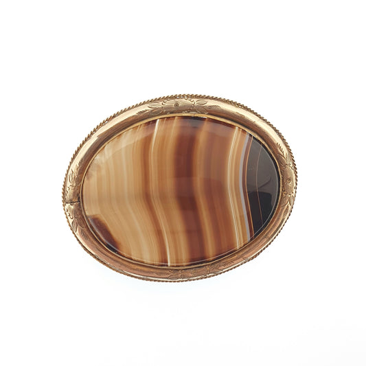 Victorian Antique Agate Rolled Gold Brooch Pin Very Large Big Huge Banded Striped Lace Quartz Chalcedony Engraved Jewelry Jewellery Vintage