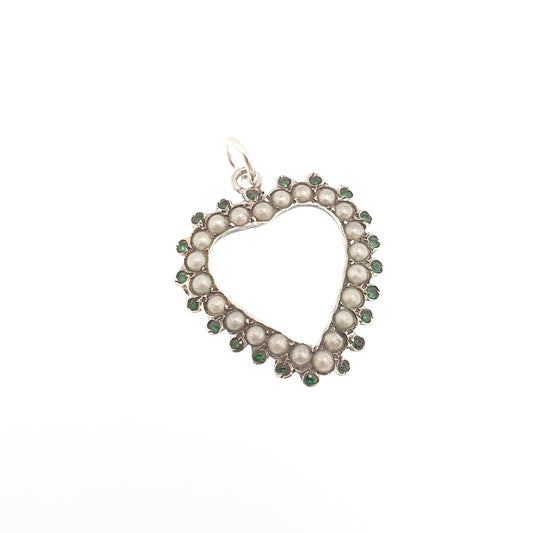Antique Victorian Solid Silver Emerald Paste Heart Pendant Seed Pearl Necklace Hanging Love Gift 1800s Vintage Womens Jewellery Jewelry
