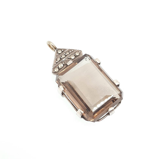 Antique Smoky Quartz Solid Silver Pendant Necklace Art Deco Marcasite Rectangular Cut Large Big Brown Gemstone Vintage Jewelry Jewellery