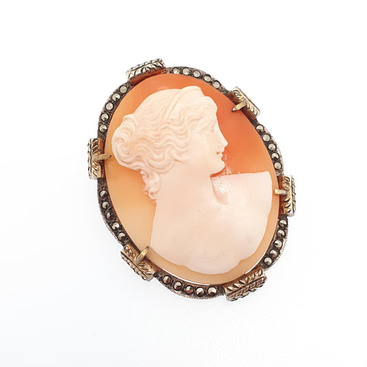 Antique Solid Silver Cameo Brooch Large Big Genuine Shell Fine Carved Marcasite Art Deco Vintage Jewelry Jewellery