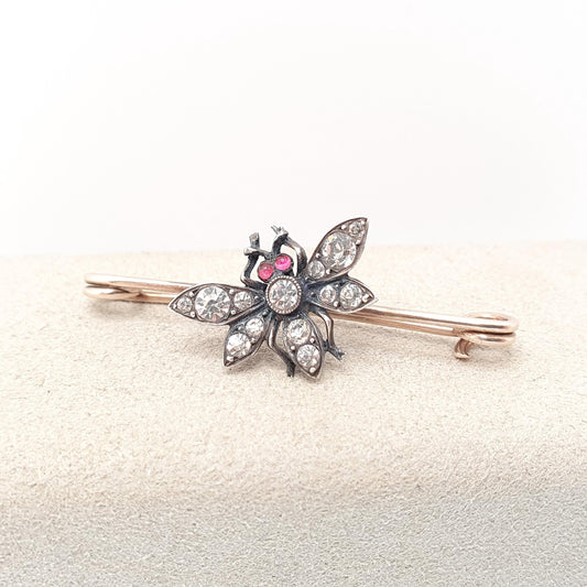 Antique 9ct Gold Fly Brooch Victorian Diamond Paste Pin Ruby Paste Eyes Solid Silver Insect Bug Solid 9k 375 Vintage Jewellery Jewelry
