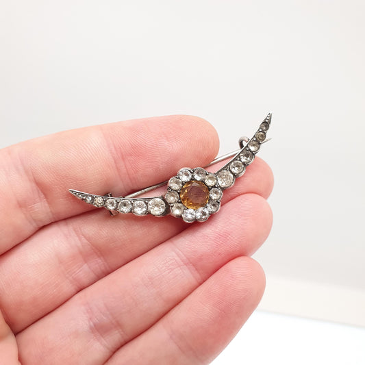 Antique Victorian Solid Silver Citrine Brooch Pin Crescent Moon Diamond Paste Celestial Natural Gemstone Vintage 1800s Jewellery Jewelry