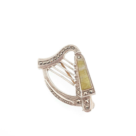 Vintage Sterling Silver Connemara Marble Harp Brooch Pin Marcasite Irish Ireland Dublin Hallmark Guinness Celtic Gaelic Jewelry Jewellery