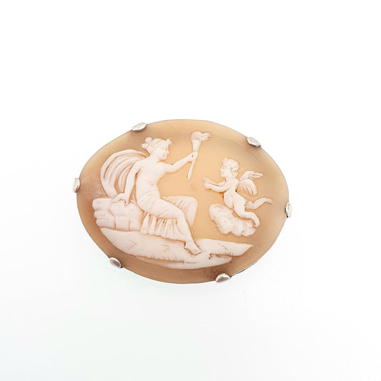 Antique Victorian Hectate & Cherub Cameo Solid Silver Brooch Torch Genuine Shell Womens Jewelry Jewellery Vintage