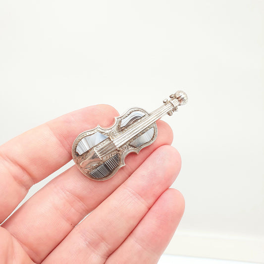 Antique Victorian Solid Silver Violin Brooch Montrose Lace Agate Scottish Cello Music Musical Instrument Vintage Gemstone Womens Jewelry