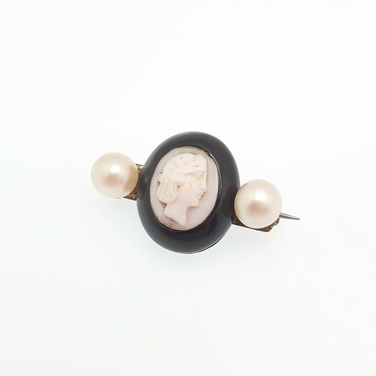 Antique Victorian Whitby Jet Cameo Brooch Cultured Pearl Pink Conch Shell Hand Carved Mourning Large 1800s Vintage Jewelry Jewellery