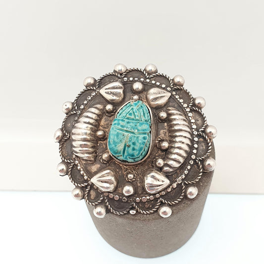 Old Vintage Solid Silver Scarab Beetle Brooch Faience Egyptian Hallmarks Insect Bug Genuine Egypt Blue Mens Womens Jewellery Jewelry