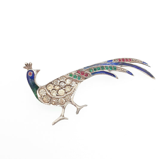 Antique Solid Silver Peacock Paste Brooch Enamel Exotic Bird Colourful Green Blue Vintage Animal Birds Sparkly Womens Jewelry Jewellery