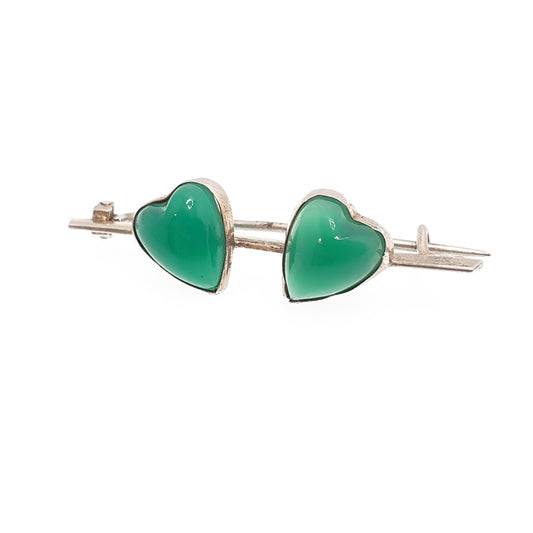 Antique Victorian Solid Silver Chrysoprase Brooch Double Heart Pin Genuine Gemstone Vintage Womens Ladies Jewelry Jewellery