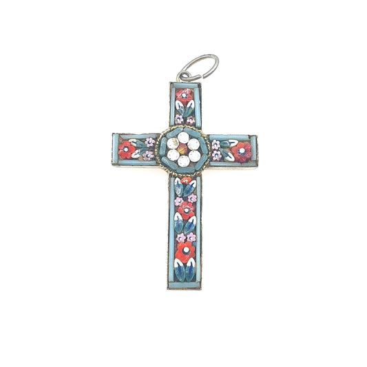 Antique Micromosaic Cross Crucifix Pendant Micro Mosaic Tiles Silver Tone Base Metal Italian Vintage Necklace Jewelry Jewellery