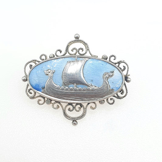 Antique Solid Silver Viking Longship Blue Enamel Brooch Scandinavian Ship Boat Nautical '830S' Art Deco Vintage Unisex Jewelry Jewellery