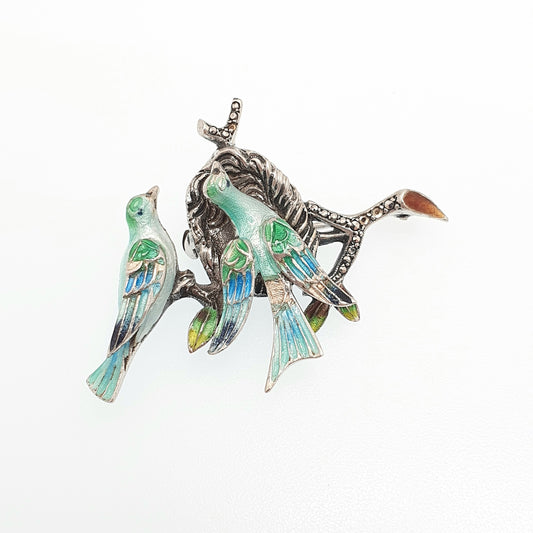 Old Vintage Solid Silver Enamel Bird Brooch Pair of Birds Nest Marcasite Art Deco Style Songbird Solid 925 Unisex Ladies Womens Jewelry
