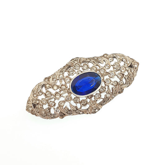 Antique Victorian Sterling Silver Sapphire Paste Brooch Diamond Pastes Art Noueavu Ornate Scroll Sparkly Vintage Womens Jewelry Jewellery
