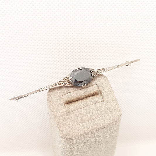 Antique Art Deco Solid Silver Hematite Brooch Pin French Marcasite Trombone Clasp 1920s Vintage Genuine Gemstone Womens Jewelry Jewellery