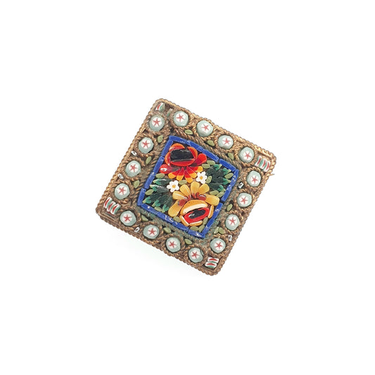 Antique Fine Micromosaic Brooch Micro Mosaic Gold Gilt Square Flower Small Millefiori Italy Italian 1800s Vintage Jewelry Jewellery