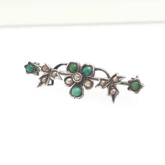 Antique Solid Silver Turquoise Brooch Victorian Bar Pin Seed Peal Flower Forget Me Not Natural Gemstone Jewelry Jewellery Vintage