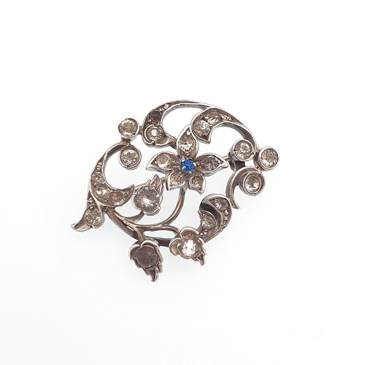 Antique Solid Silver Sapphire & Diamond Paste Brooch Victorian Art Nouveau Pin 1800s Sparkly Vintage Womens Jewelry Jewellery