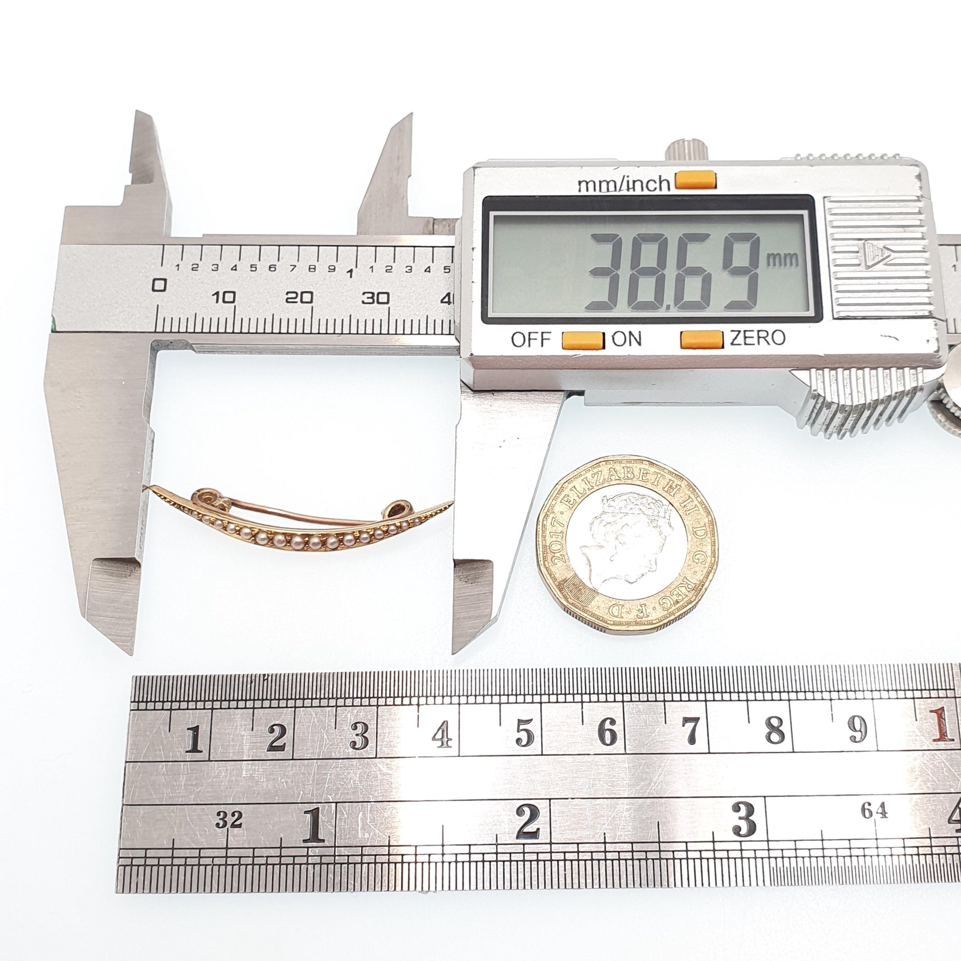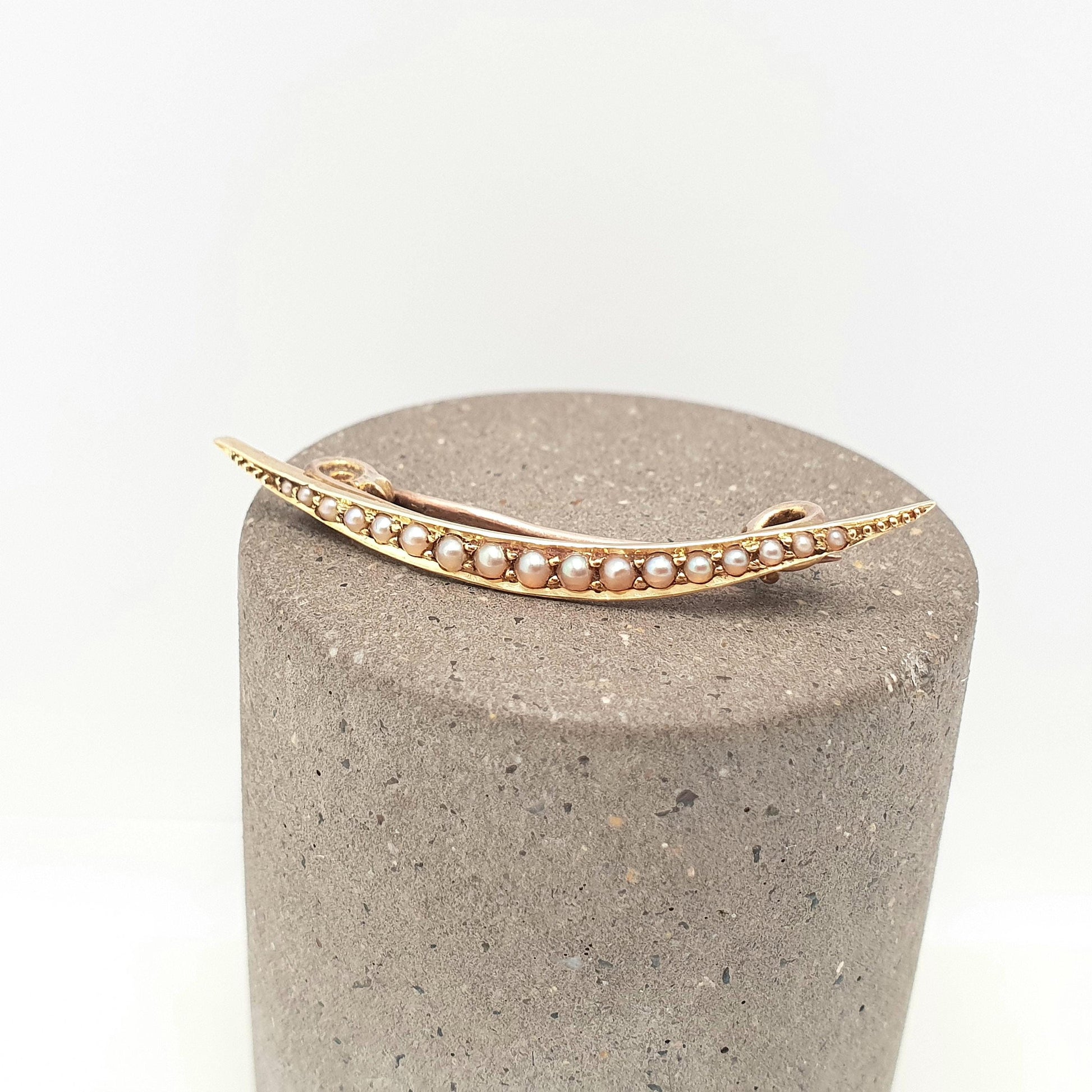 DESCRIPTION: A stunning antique Victorian solid 14k gold and solid 9k gold crescent moon brooch, adorned with a numerous seed pearls. The item weighs approx. 1.91g size dimensions are in the later photos. As to be expected with its age, it isn't stamped/hallmarked, it tests for solid 14k gold and solid 9k gold. The crescent moon section is 14k gold and the safety pin section is 9k gold. The safety pin section may have been added at a later date, hence the different gold purities. The brooch is a little mishappen in areas, see pictures/video.