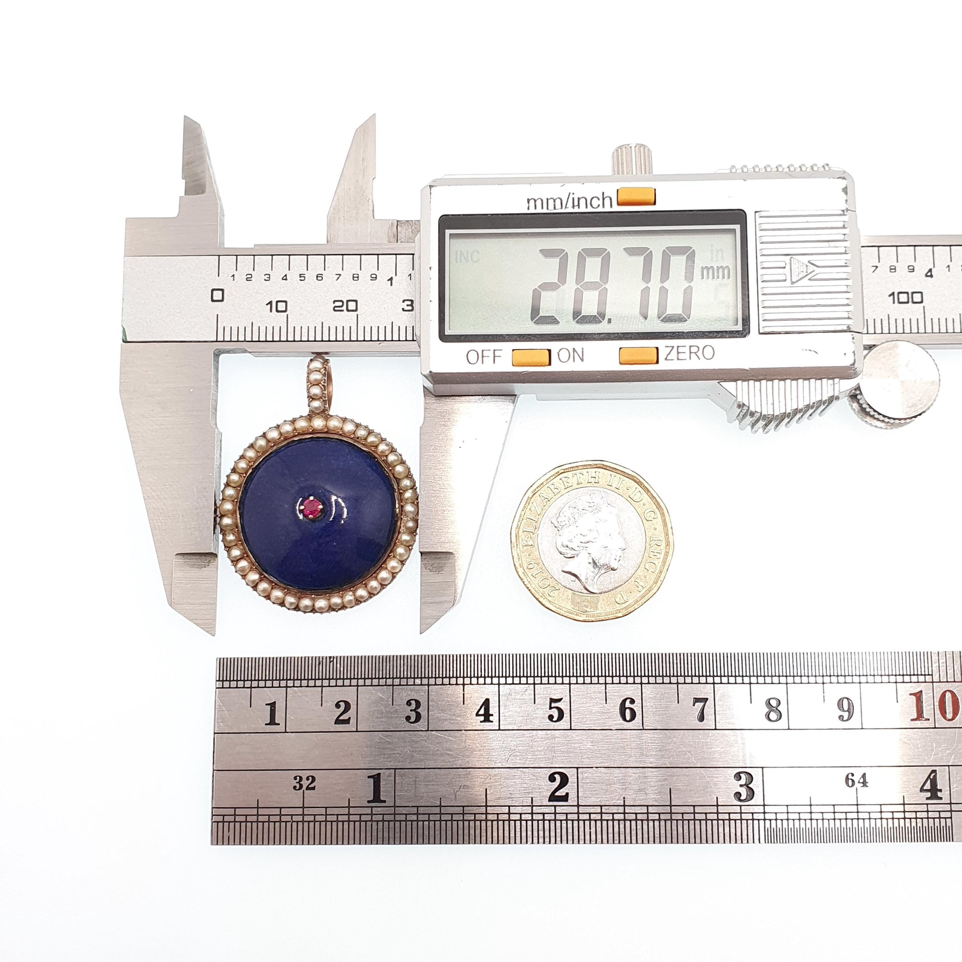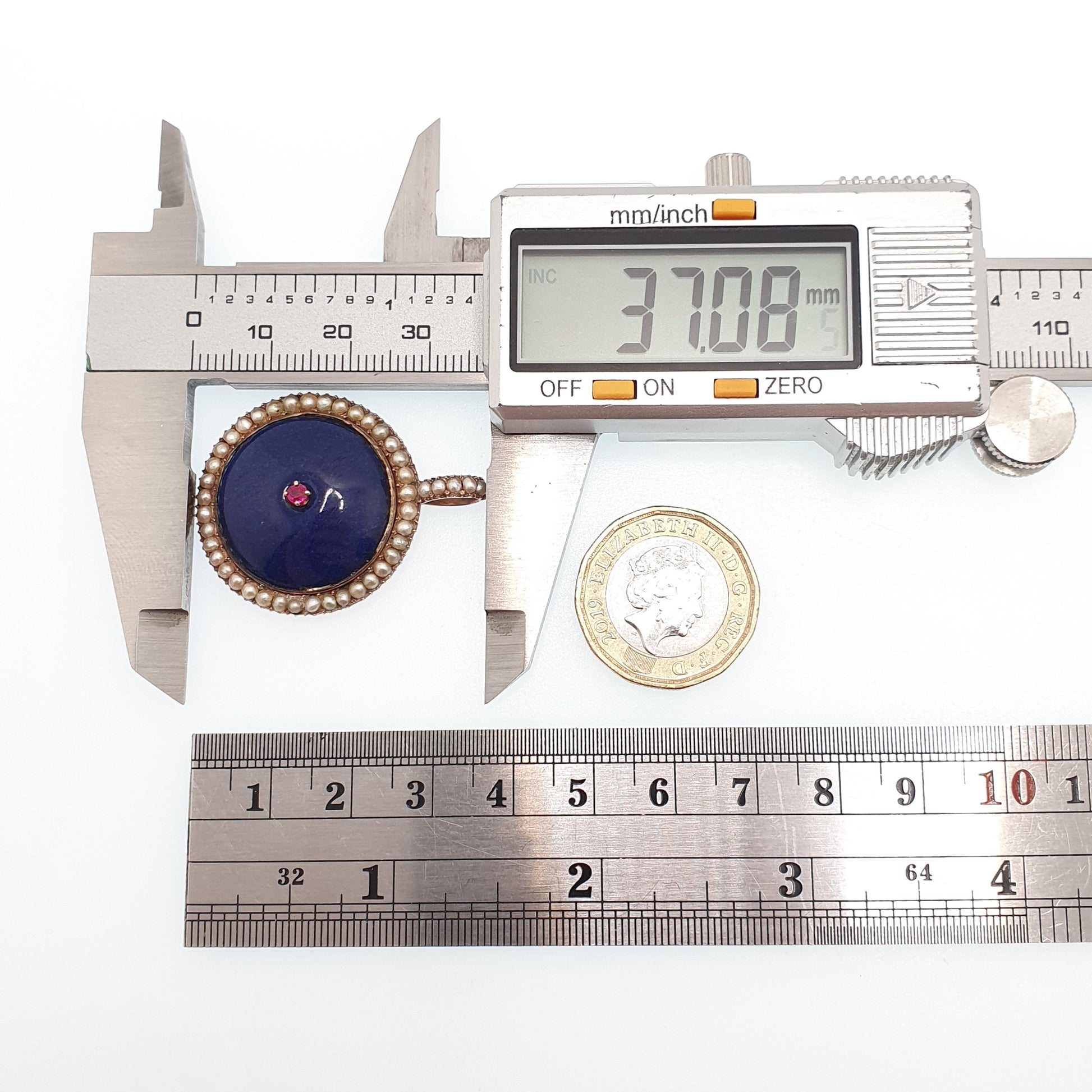 DESCRIPTION: A beautiful antique Victorian solid 14kt gold locket, adorned with a ruby, seed pearls and blue enamel. The locket open and closes well and has the original glass on the rear. It weighs approx. 8.84g and the size dimensions are in the later photos. As to be expected with the items age, it isn't stamped/hallmarked, it tests for solid 14k gold. There are some minor marks on the enamel and some of the border surrounding the enamel section has lifted slightly.