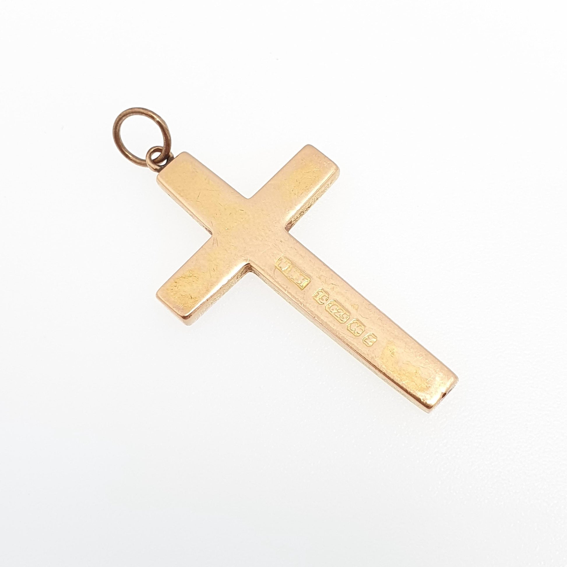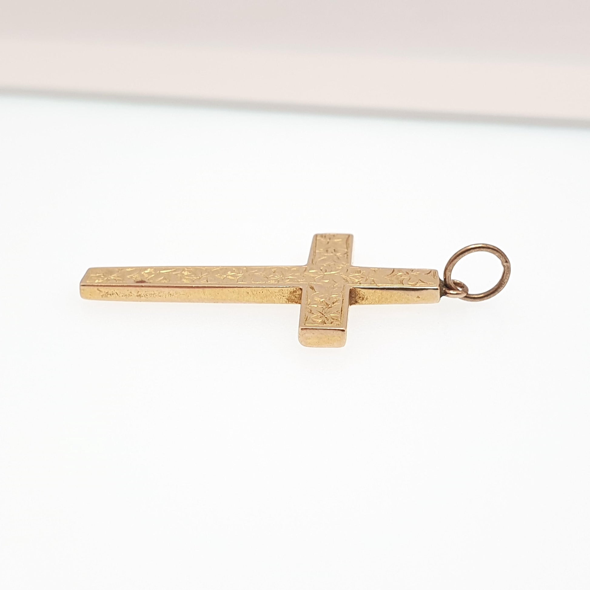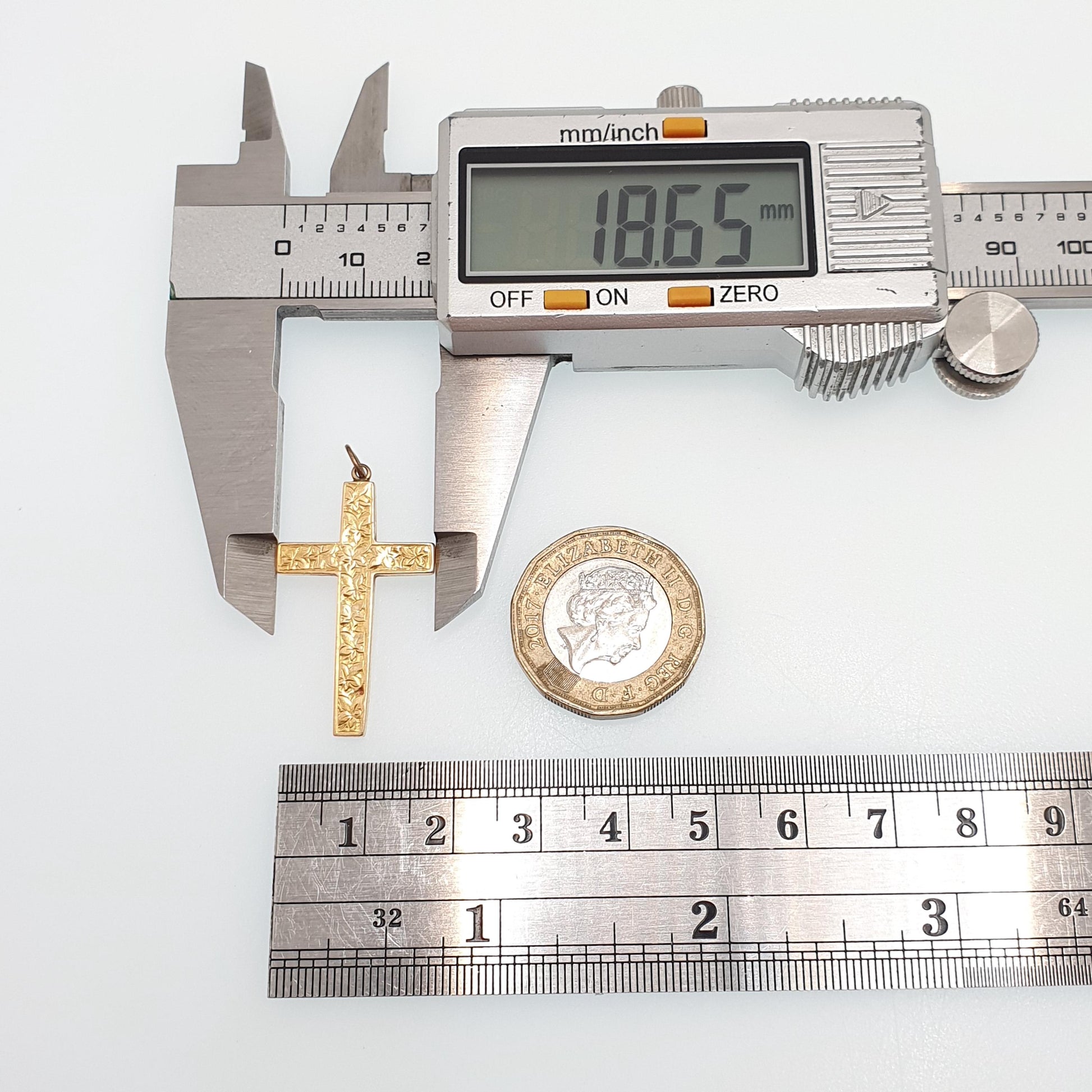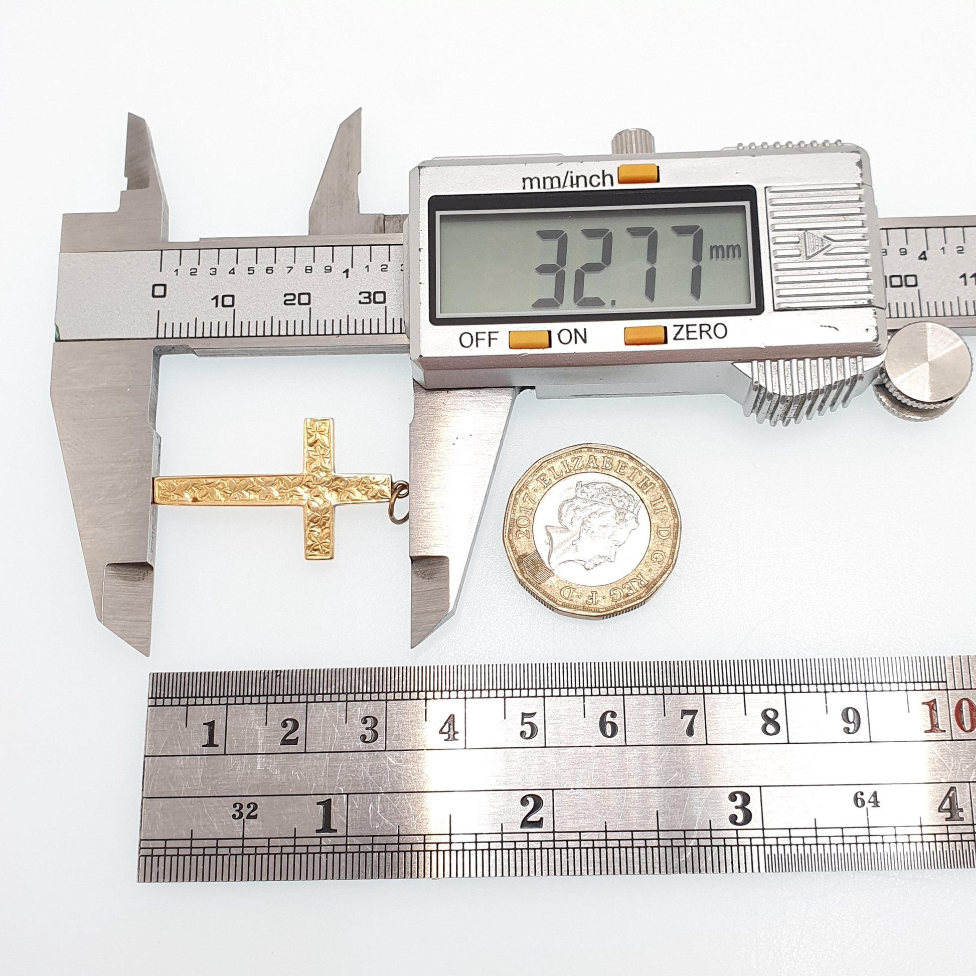 DESCRIPTION: A lovely antique Victorian solid 15ct yellow gold crucifix pendant, with an ornately engraved face. It's hallmarked for 15ct gold, dating to 1899. It's hollow in the core and weighs approx. 1.09g, therefore lightweight. The size dimensions are in the later photos. There are some minor dents, mainly one on the front near the bottom spoke, see pictures/video.