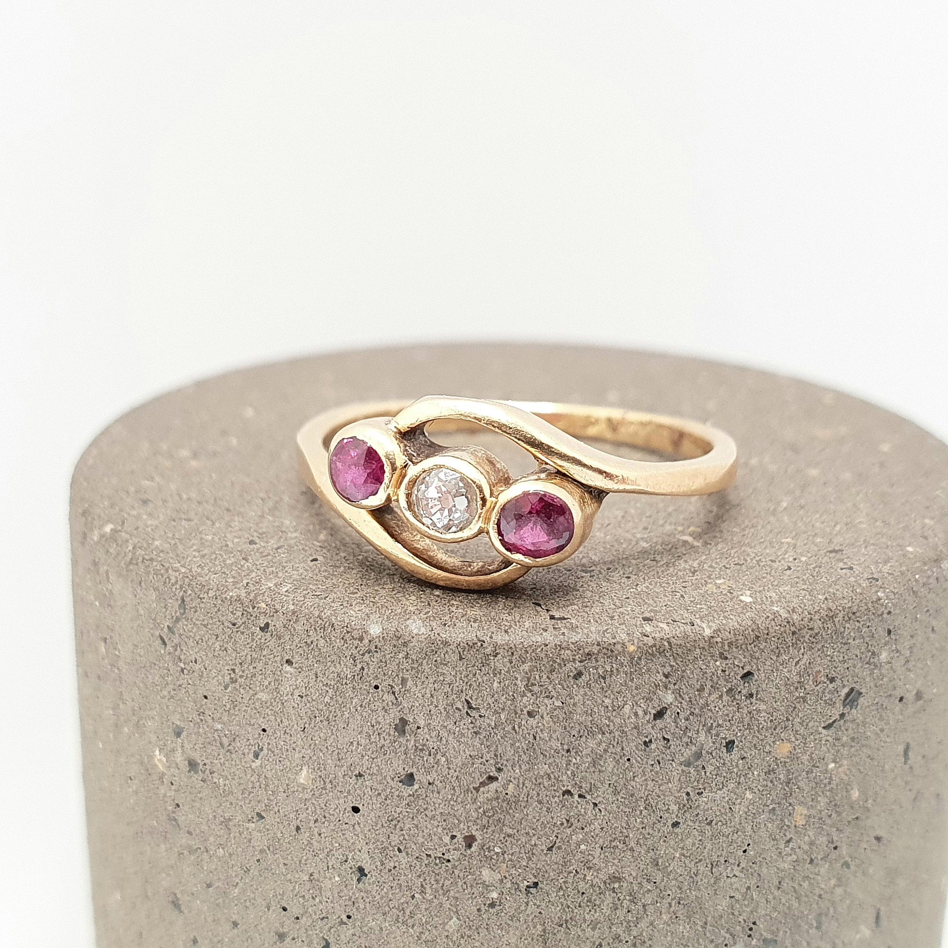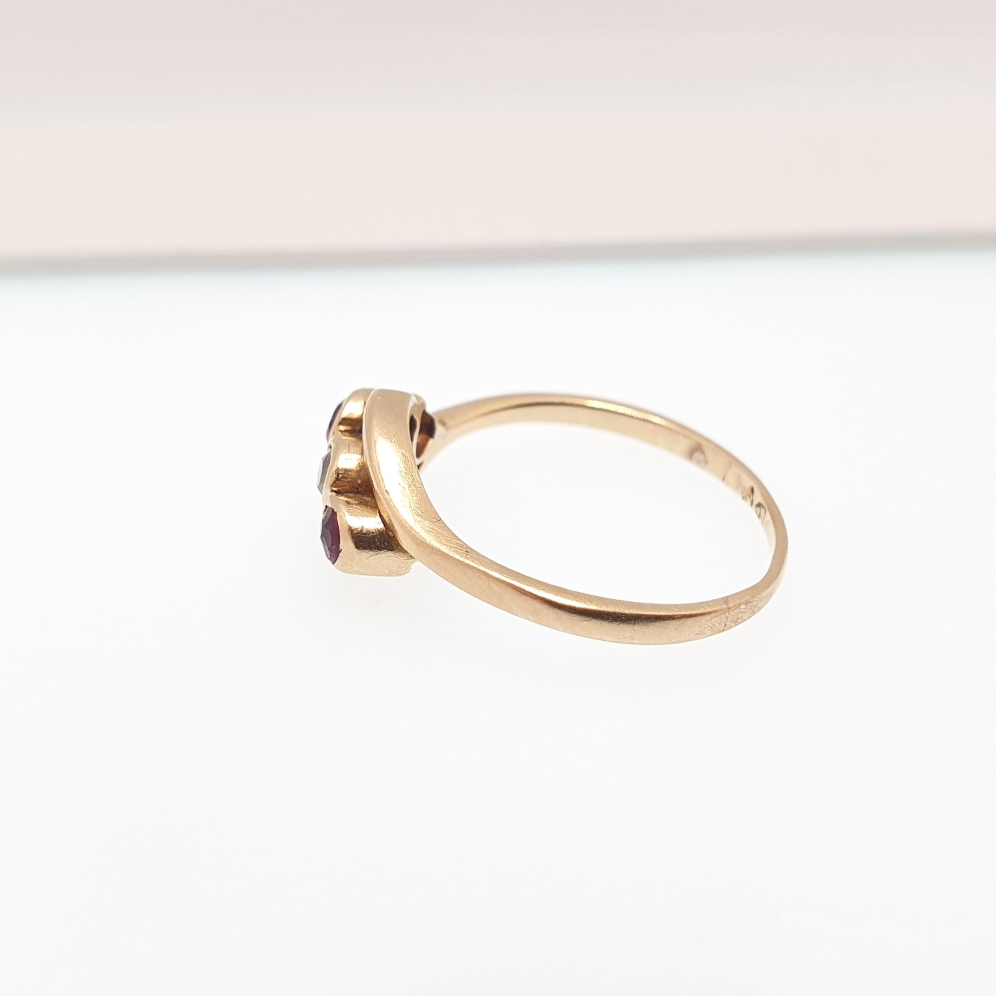 DESCRIPTION: A stunning antique solid 18ct 750 gold ring, adorned with old cut rubies and diamond. The ring is a crossover trilogy in style. It weighs approx. 2.00g and sizes approx. at UK K.5 or US 5.5. The ring has the remnants of a Chester gold hallmark, it looks like the mark have worn from a previous resize. The ring tests for solid 18ct gold.
