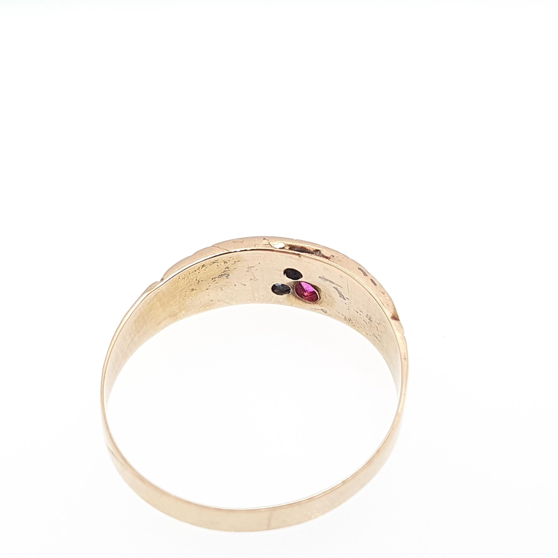 DESCRIPTION: A stunning antique Victorian solid 18ct 750 gold ring, adorned with a blue sapphire, ruby and diamond (100% tested). The ring is fully hallmarked for 18ct gold, dating to 1898. It sizes approx. at just below UK Q or US 8.25 and weighs approx. 1.63g. The ring has a perforation line in the side of the head of the ring, see picture 8.
