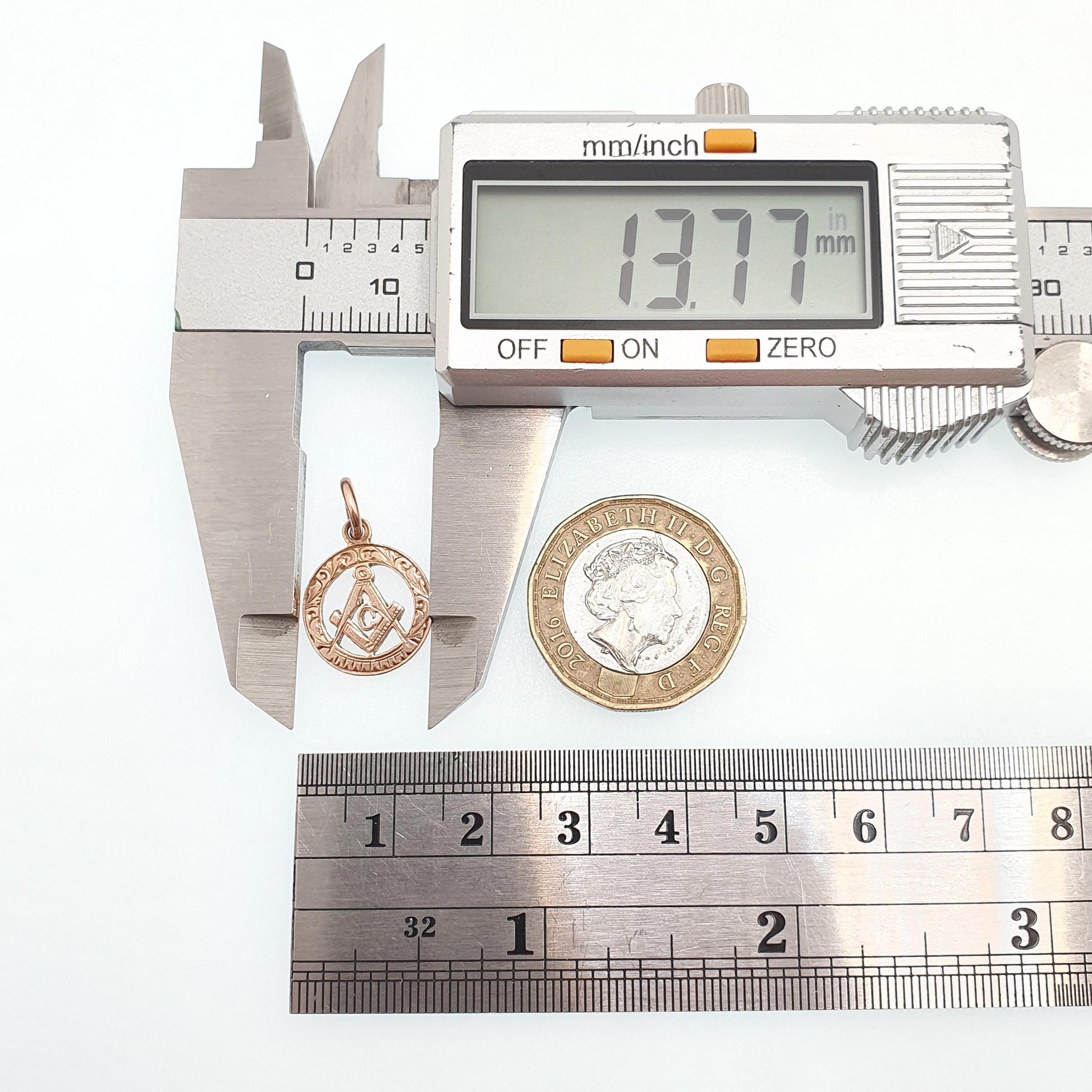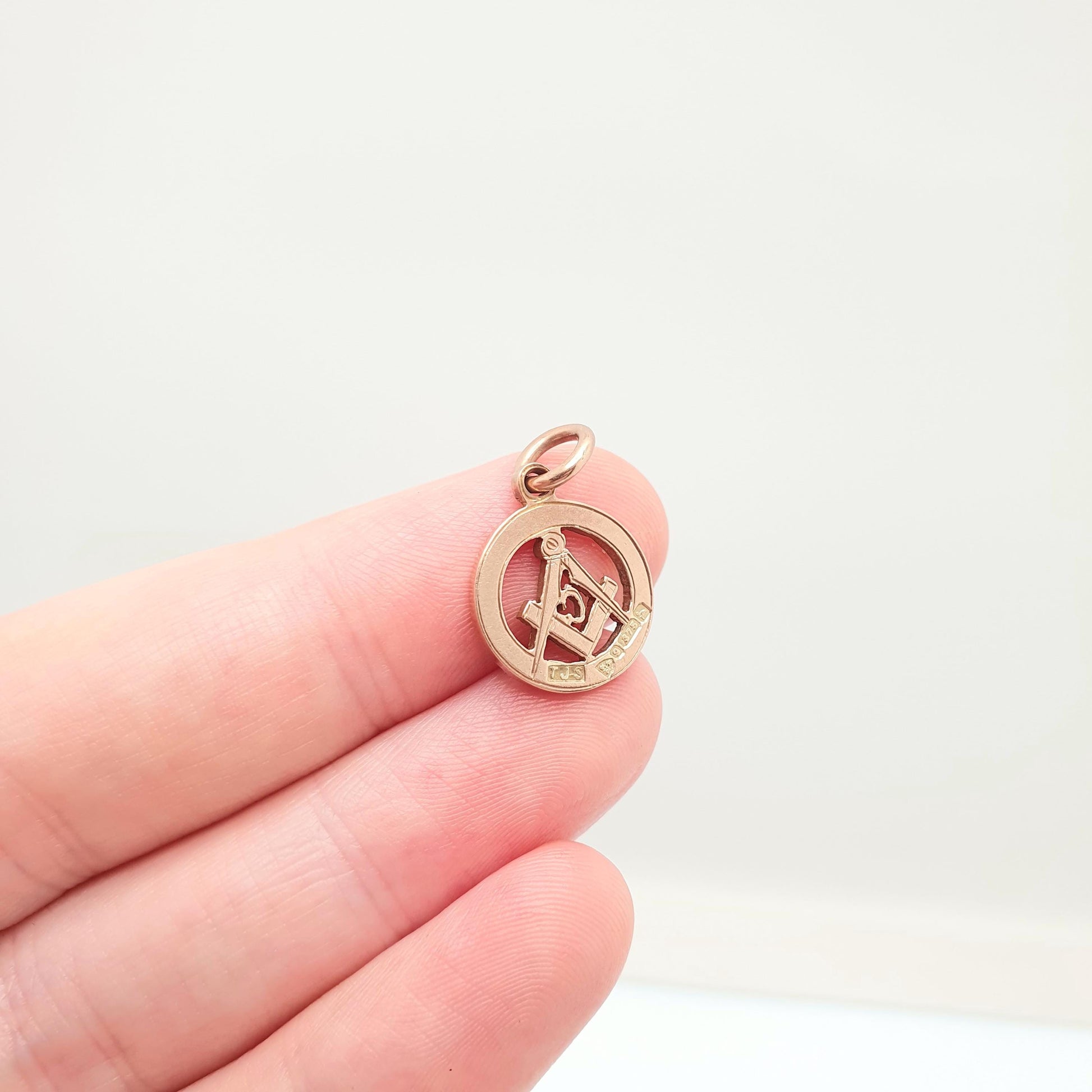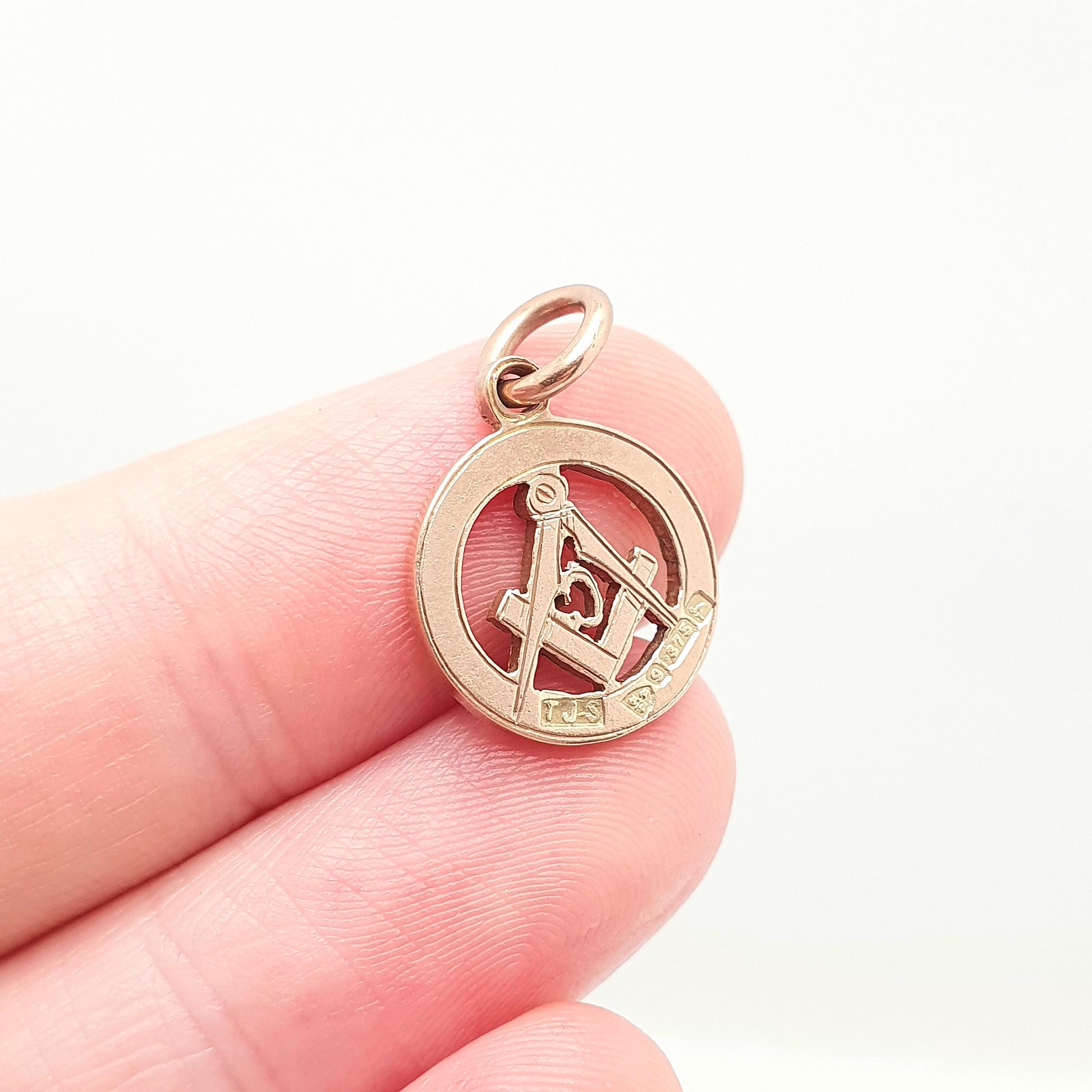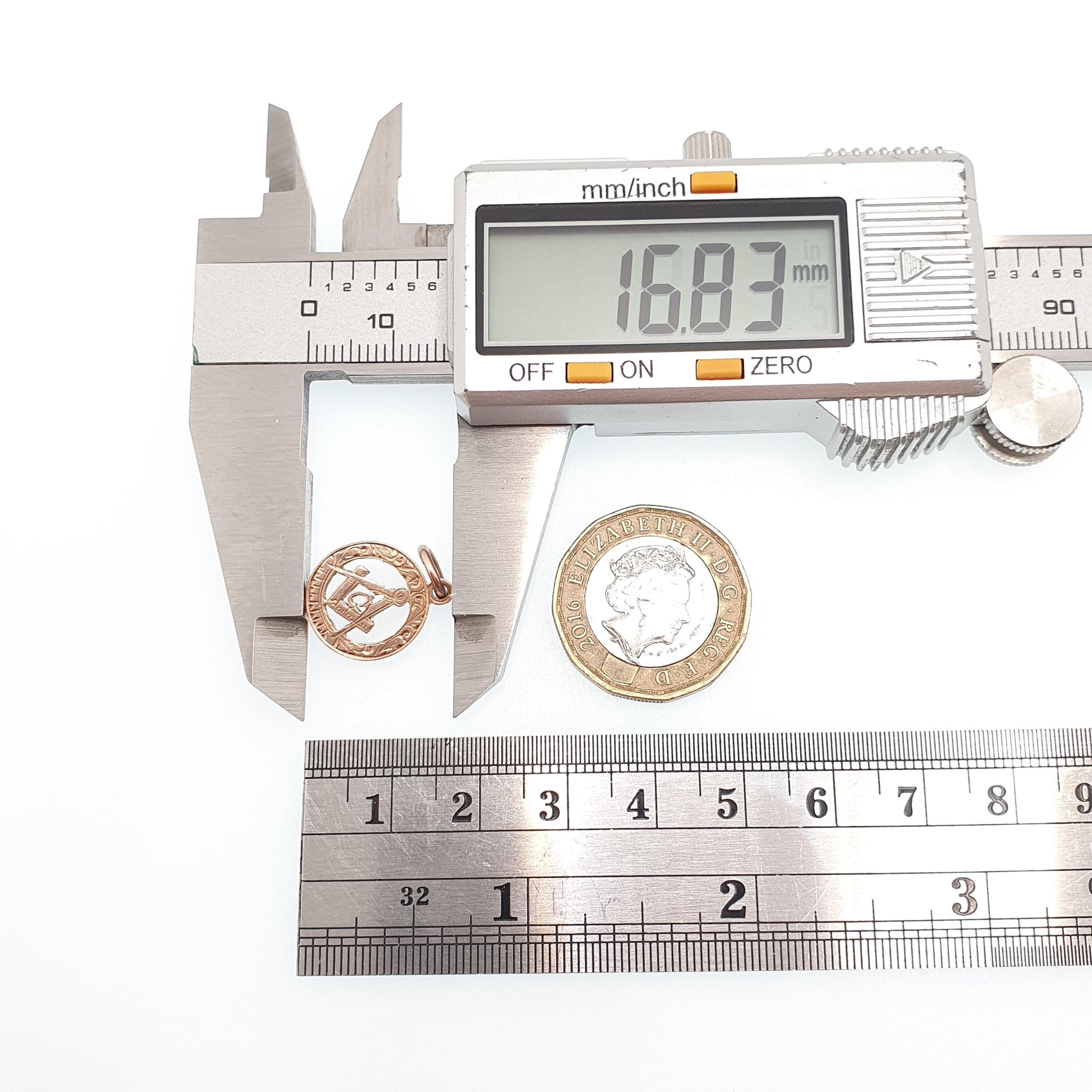 DESCRIPTION: A true antique solid 9ct 375 rose gold masonic charm pendant, in the shape of the square and compasses with an engraved finish. The item is fully hallmarked, dating to 1901 and weighs approx. 2.05g. The size dimensions are in the later photos.