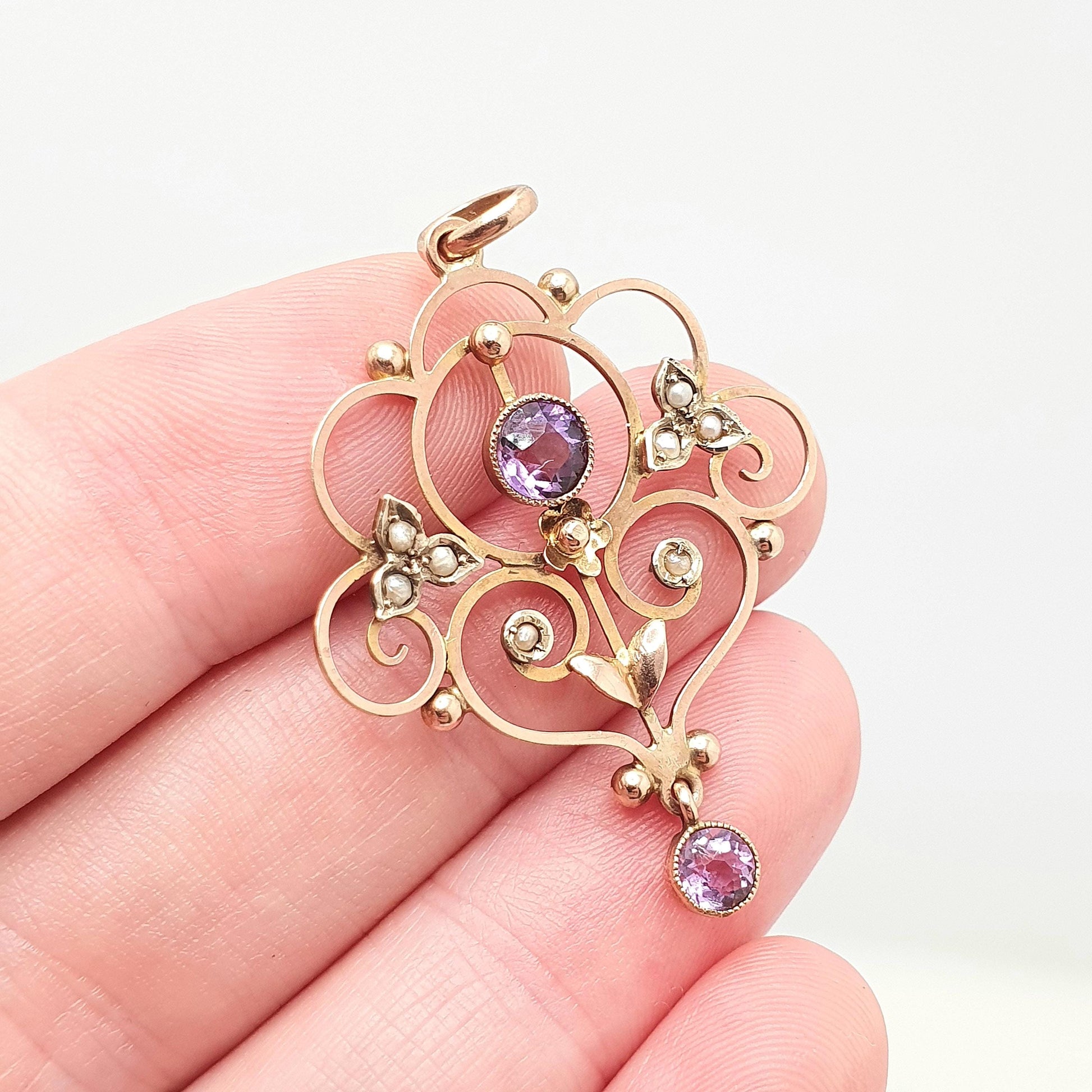 DESCRIPTION: A beautiful antique Edwardian solid 9ct 375 gold openwork pendant, adorned with amethysts and seed pearls. It weighs approx. 2.61g and the size dimensions are in the later photos. It's stamped "9ct".