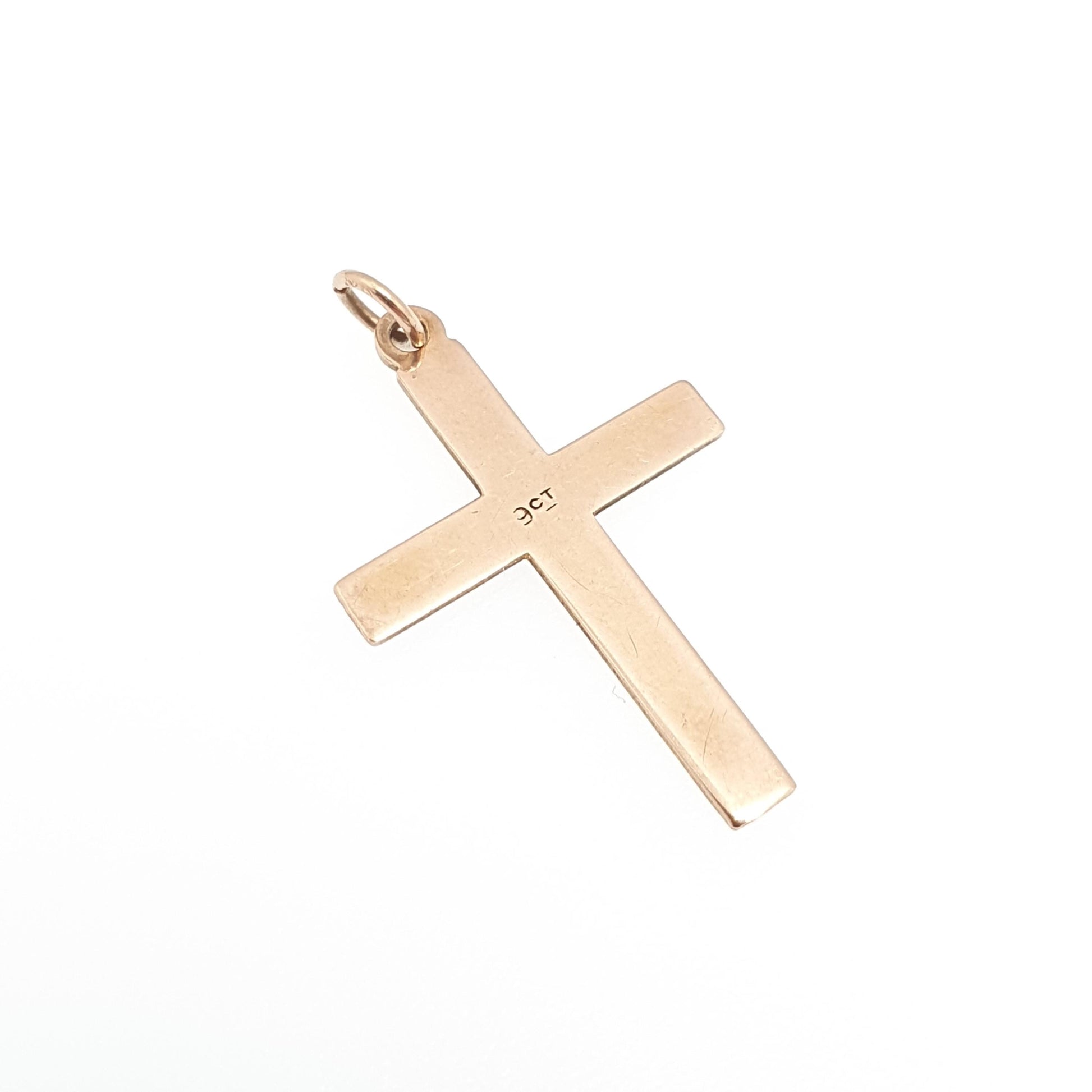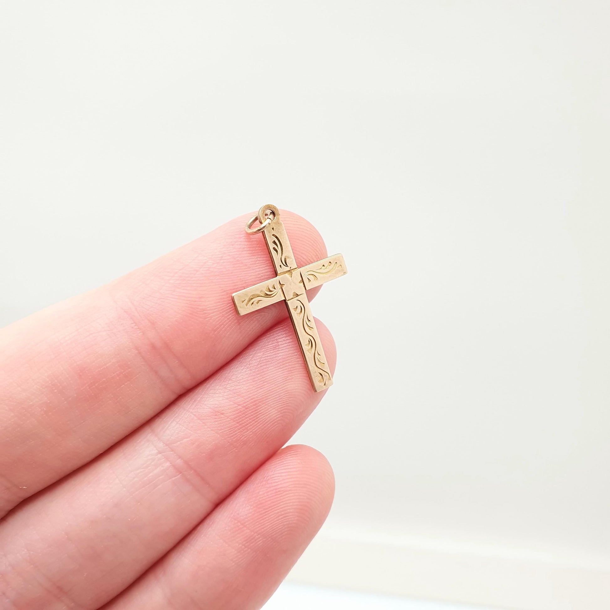 DESCRIPTION: A lovely antique solid 9ct 375 gold crucifix pendant, with an engraved face. It's stamped "9ct" for 9ct gold. It weighs approx. 0.75g and the size dimensions are in the later photos.