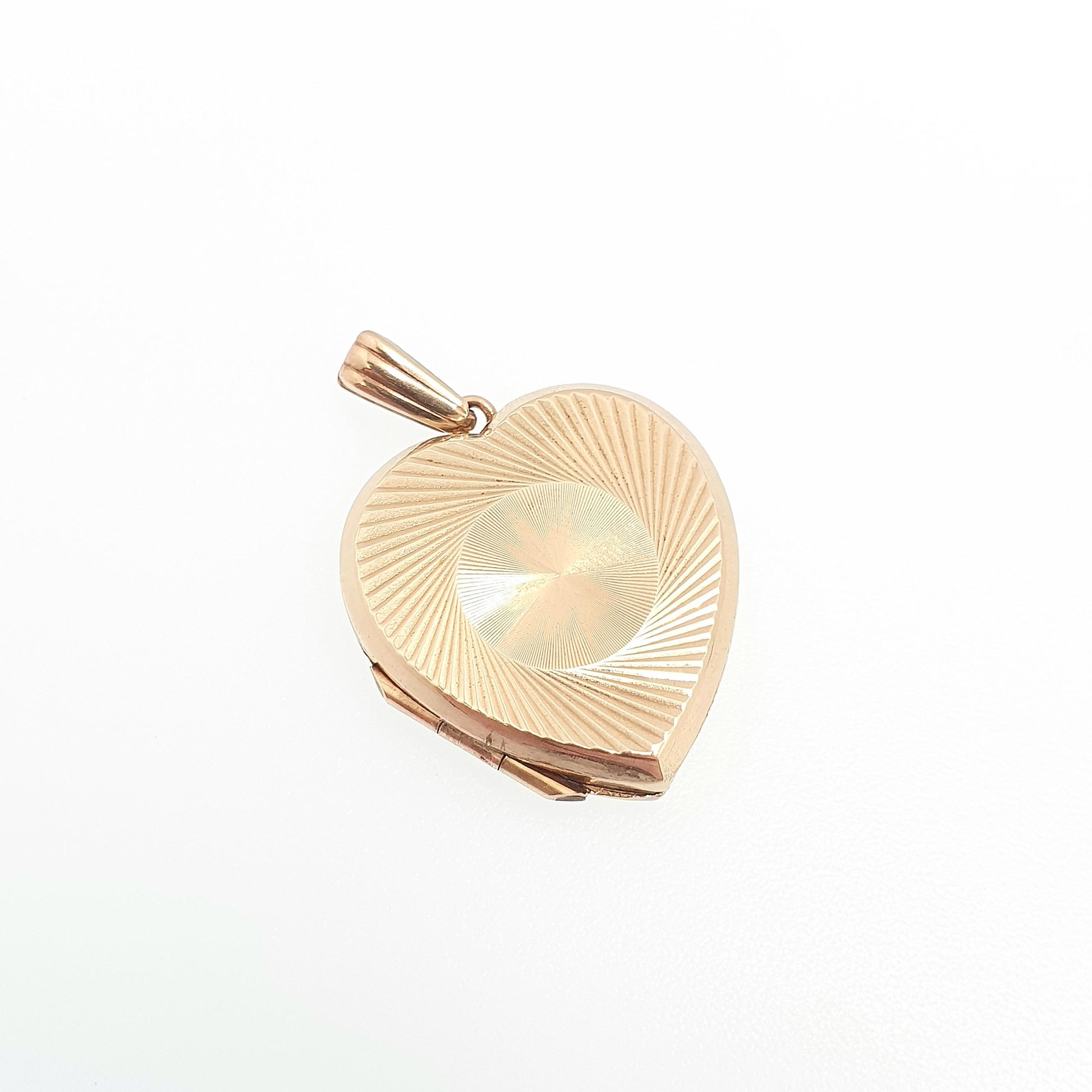 DESCRIPTION: A beautiful antique 1920s heart shaped locket, with a solid 9ct 375 gold back and front (not rolled gold, it has two panels of real solid 9ct 375 gold on either side) and base metal frame. The locket has a gyroscope pattern on the face. It closes tightly and still has its original pictures retaining shims on both sides. The locket is stamped "9CT BK-FT" and weighs approx. 3.98g. It has some dark patina marks on the inside.