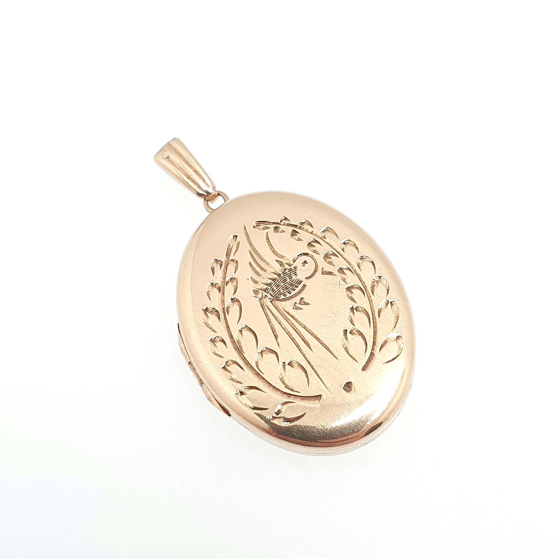 DESCRIPTION: A stunning vintage solid 9ct gold locket, hand engraved with a bird. The item is made completely of solid 9ct gold, including the hinge and bail etc. It's fully hallmarked for 9ct gold, dating to 1970. It weighs approx. 4.35g, opens/closes well and the size dimensions are in the later photos.