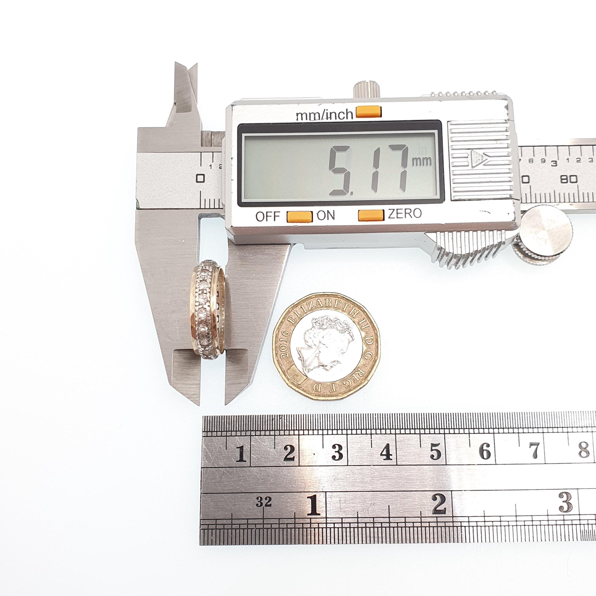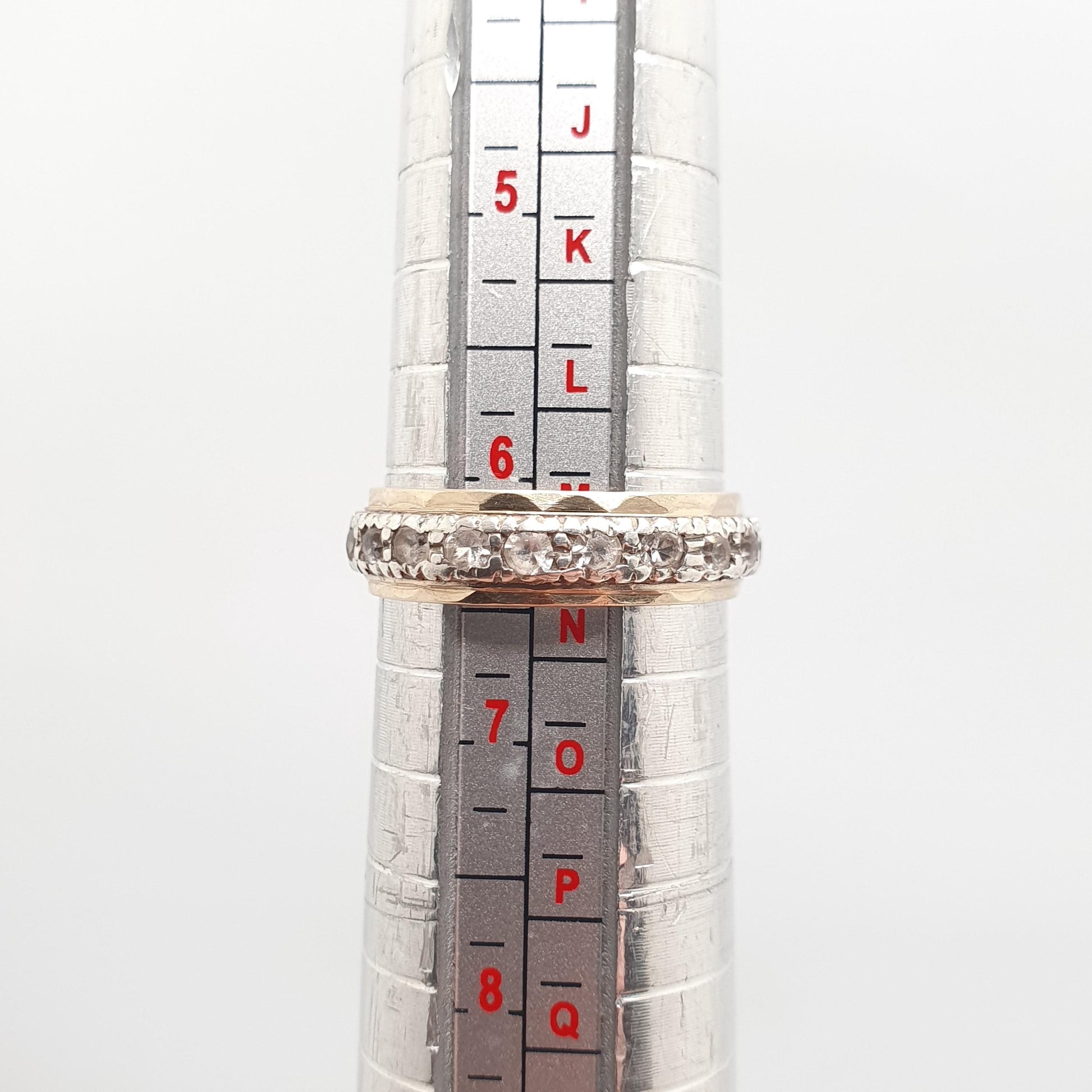 DESCRIPTION: A genuine antique art deco eternity ring from the 1920s. The ring is made from solid 9ct 375 yellow gold rims and sterling silver central band. It's adorned with real white spinel gemstones (100% tested). The ring sizes at approx. UK M or US 6.25 and weighs approx. 2.56g. It is stamped "9CT SIL". To confirm, the gold coloured metal is solid 9ct gold and the silver coloured metal is sterling silver.