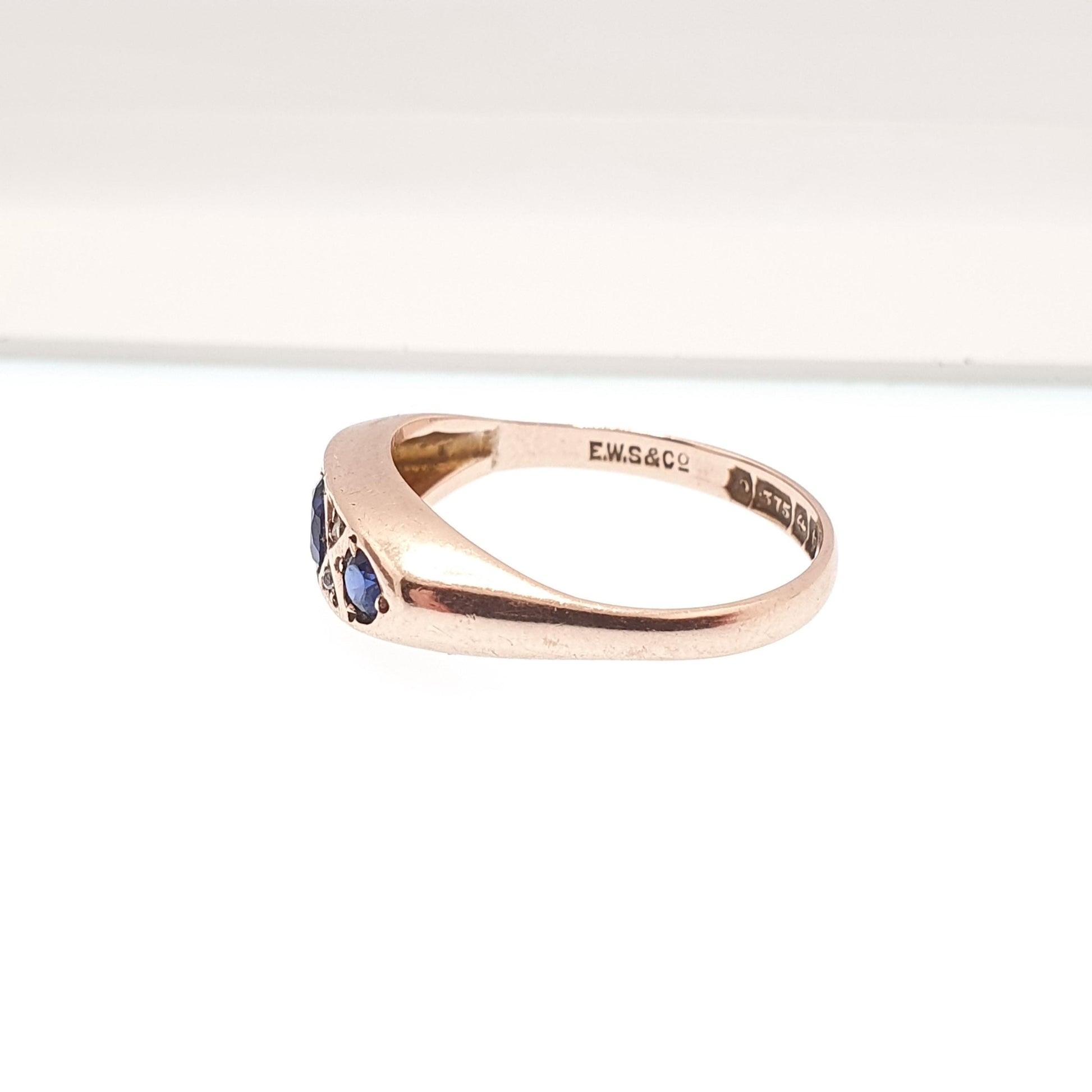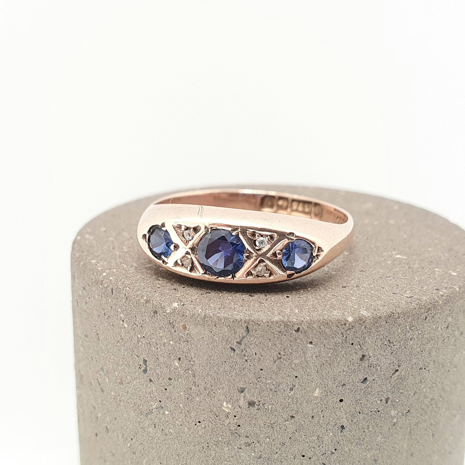 DESCRIPTION: A beautiful and genuine antique solid 9ct 375 rose gold ring, adorned with a blue sapphires and diamonds. The ring is fully hallmarked for 9ct gold, dating to 1918. It sizes approx. at UK Q or US 8 and weighs approx. 2.59g. It looks like 2 of the diamonds have been replaced at some point in the items life, they're slightly brighter and brilliant cut.