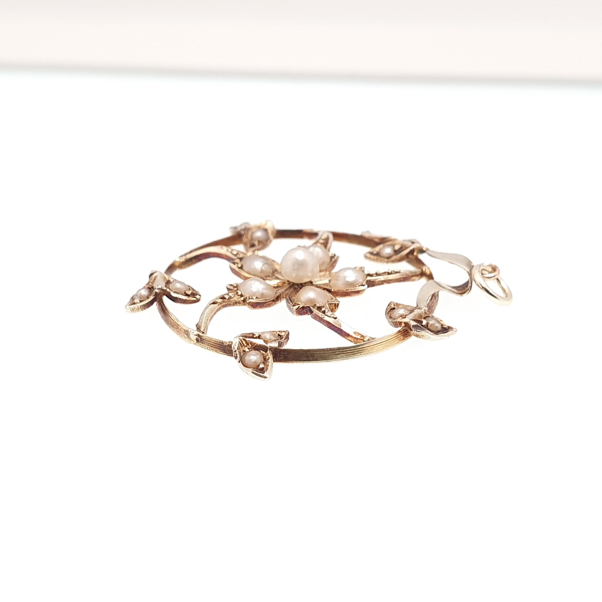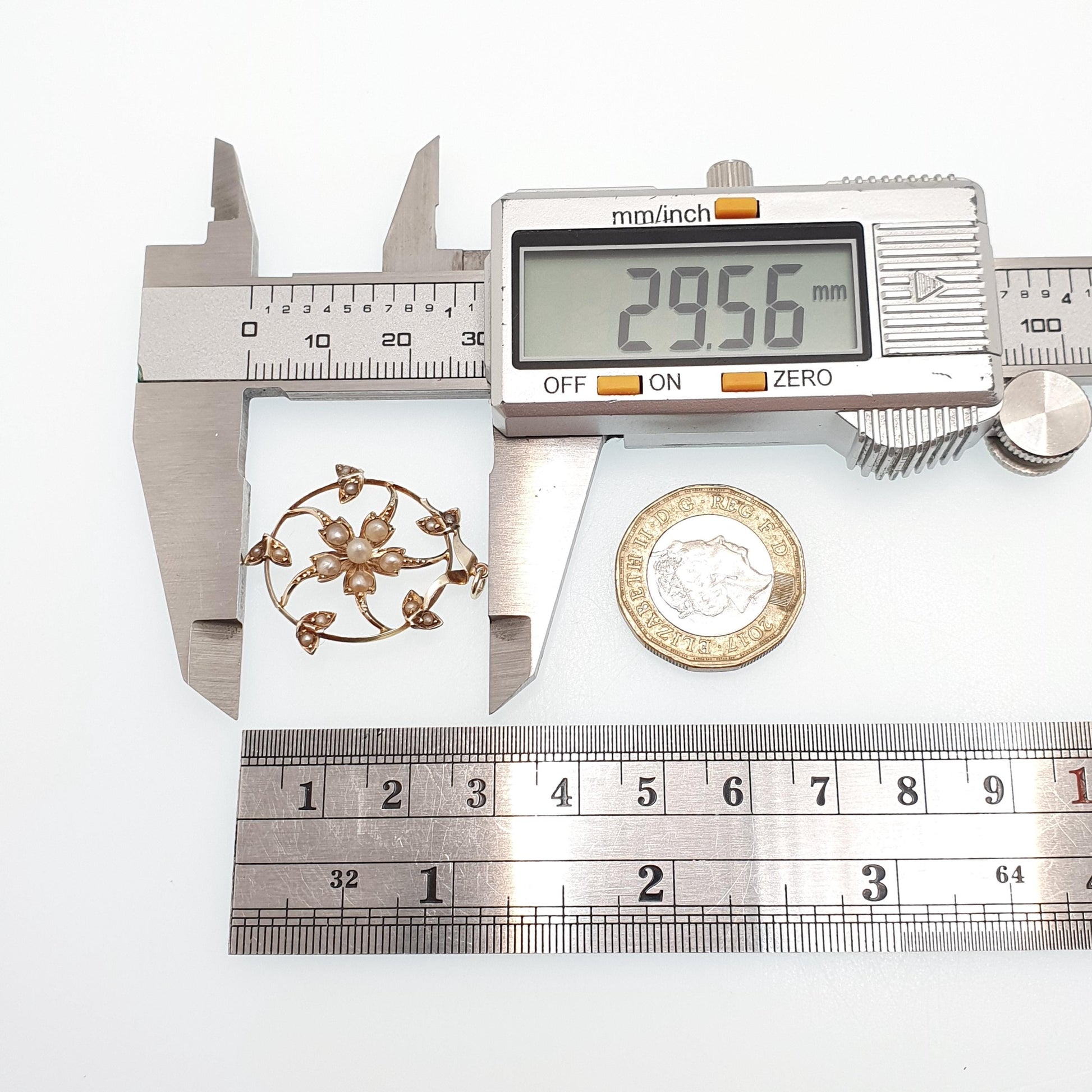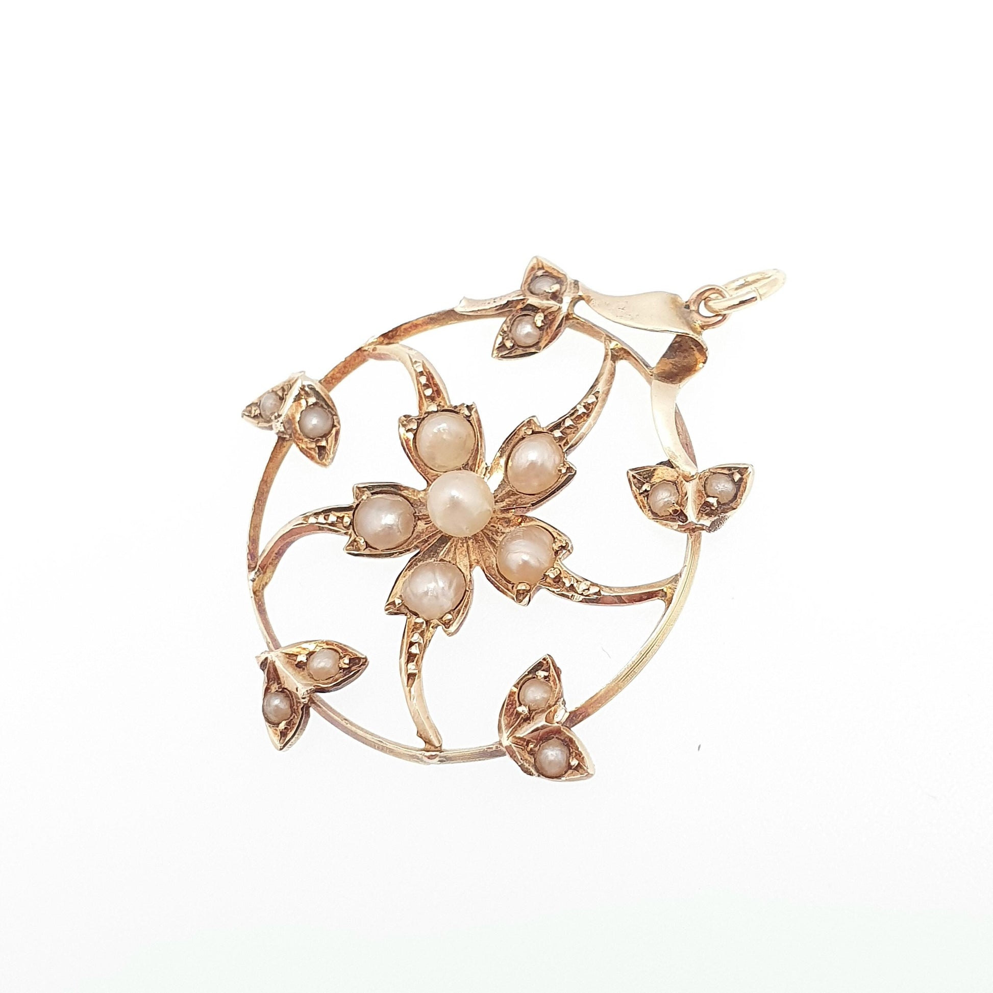 DESCRIPTION: A gorgeous antique solid 9ct gold flower pendant/brooch, adorned with numerous seed pearls. The item weighs approx. 2.23g and the size dimensions are in the later photos. It's stamped "9ct" for 9ct gold.
