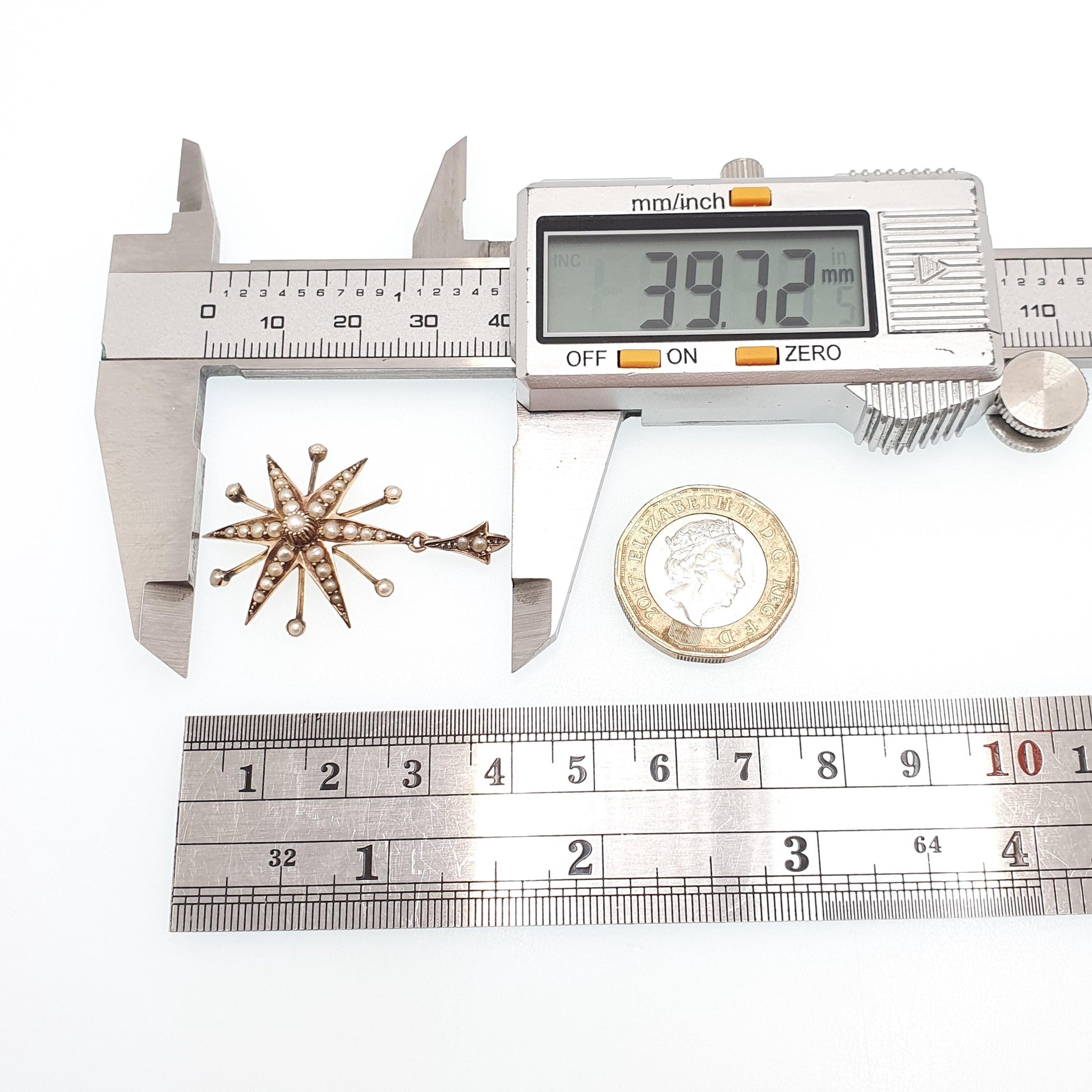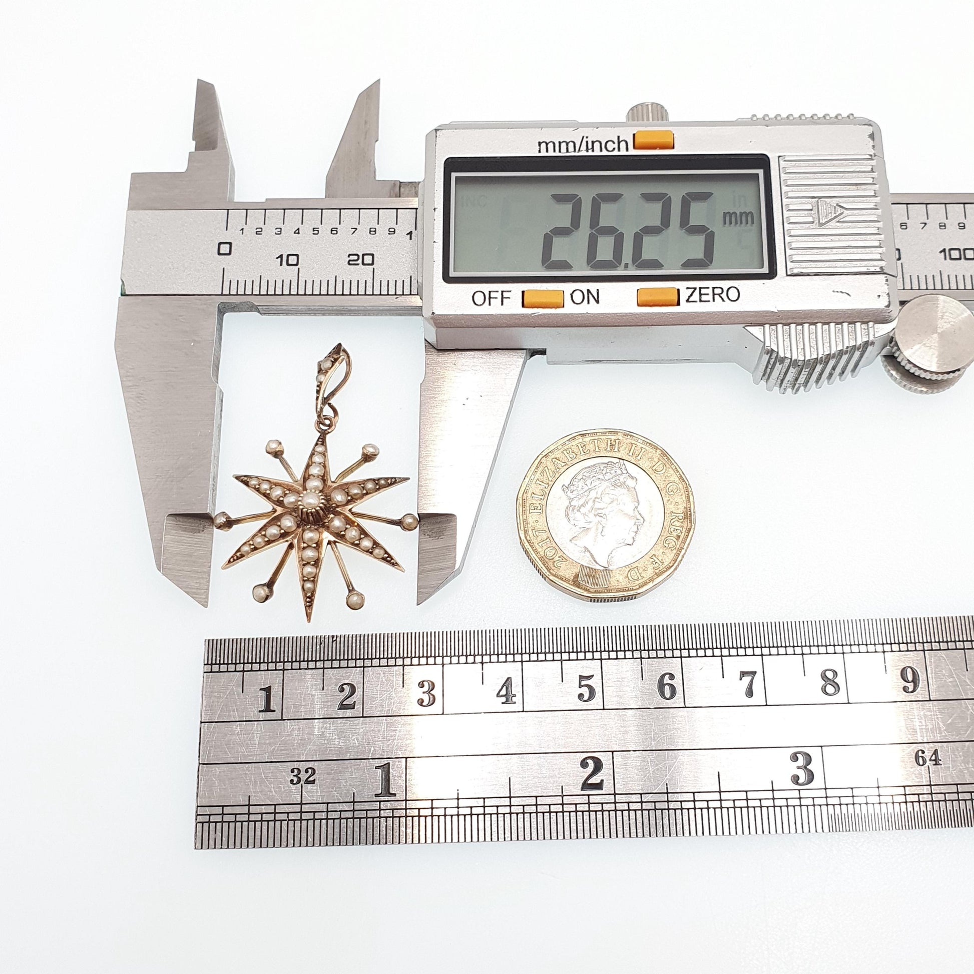 DESCRIPTION: A gorgeous antique Victorian solid 9ct gold star pendant necklace, adorned with natural seed pearls. The item weighs approx. 2.42g and the size dimensions are in the later photos. It's stamped "9ct" on the rear.