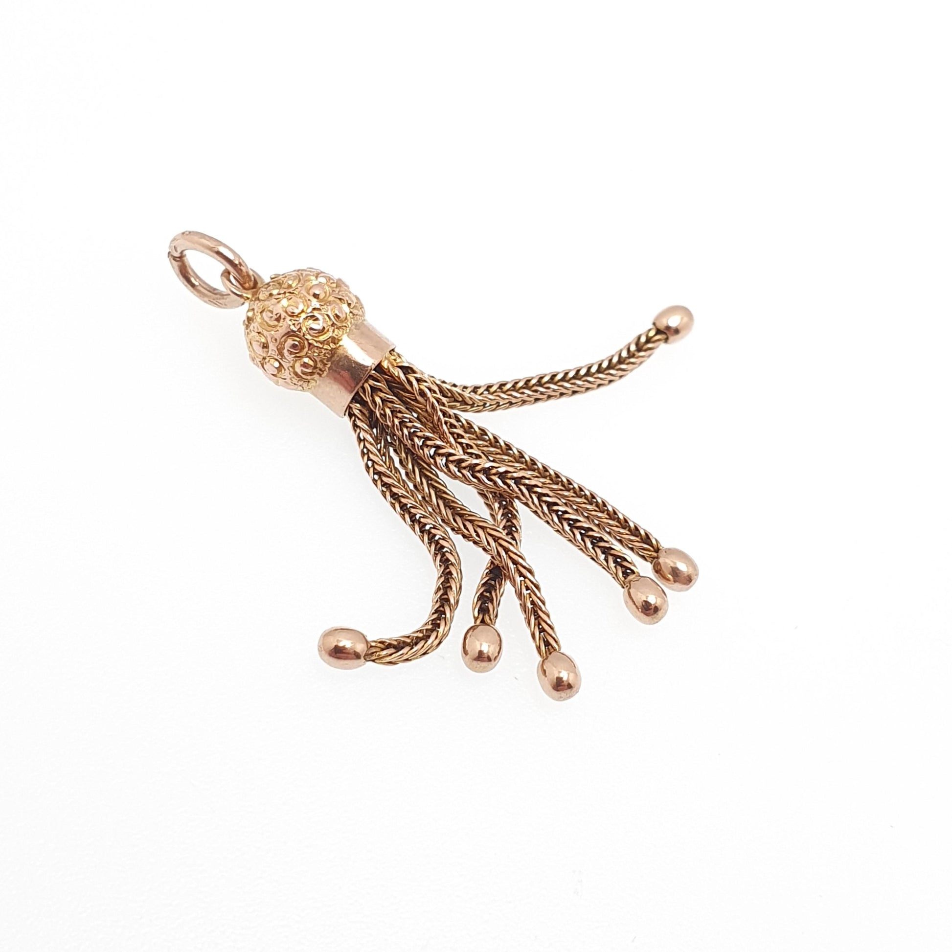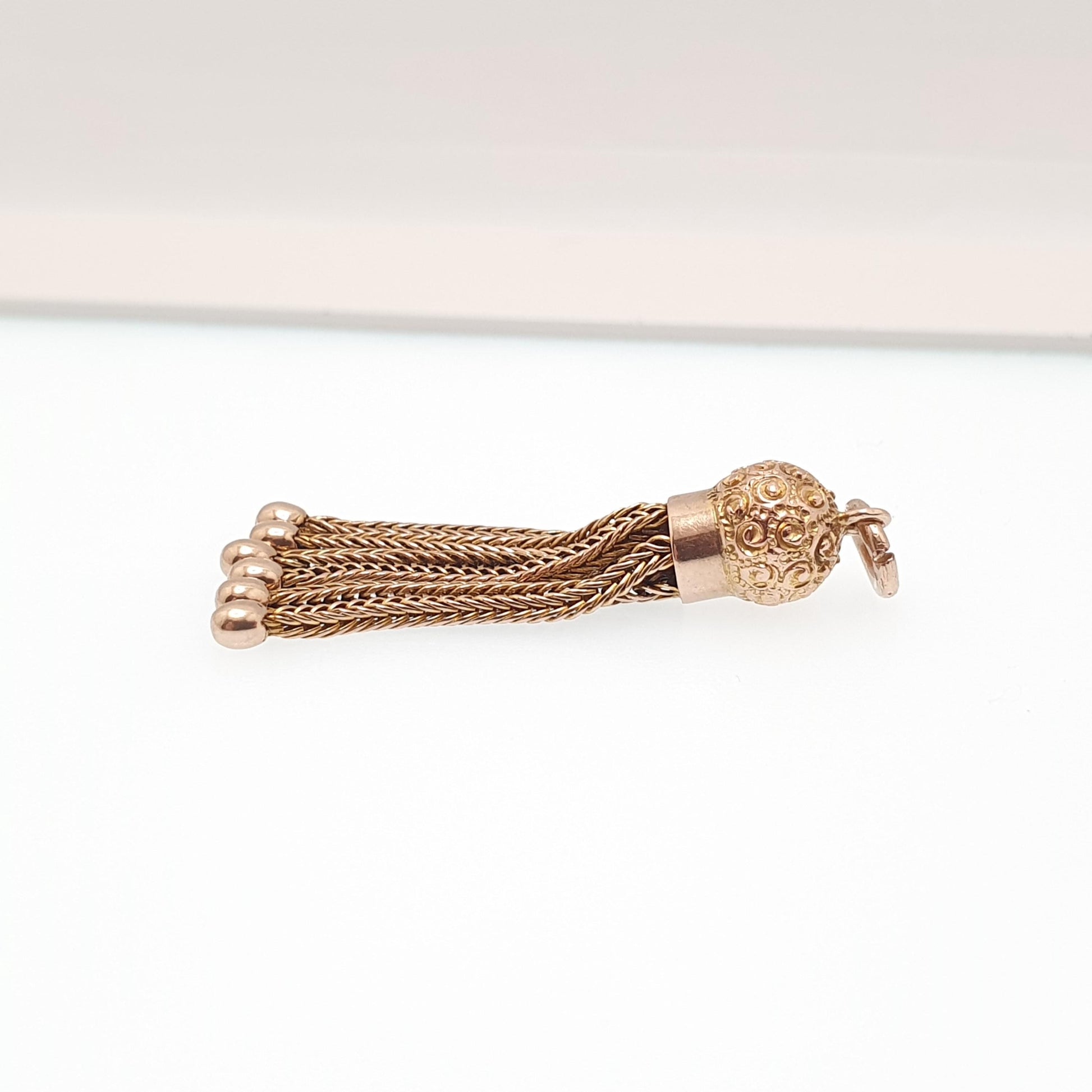 DESCRIPTION: A true antique Victorian tassel fob made from solid 9ct 375 yellow gold. The rounded head has beautiful patterned finish and the tassels are in good condition. It weighs 2.36g and the size dimensions are in the later photos. As to be expected the item isn't stamped/hallmarked, it tests for solid 9ct gold.