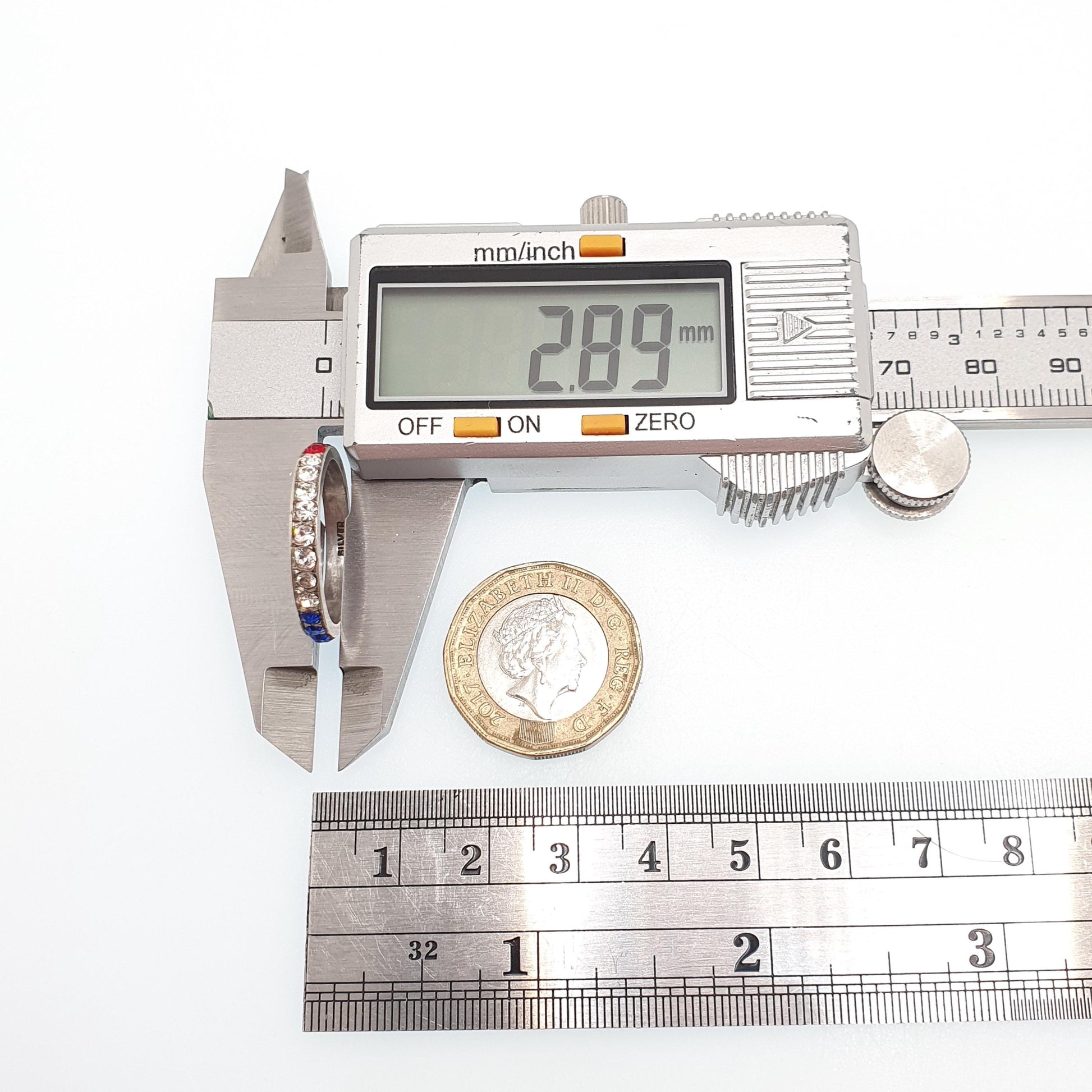 DESCRIPTION: A superb and rare antique 1920s solid silver eternity band ring, adorned with numerous red, white and blue pastes. The colours are to symbolise the Great British flag (or United States). It measures at approx. UK Q or US 8, weighs approx. 2.29g and is stamped "SILVER".